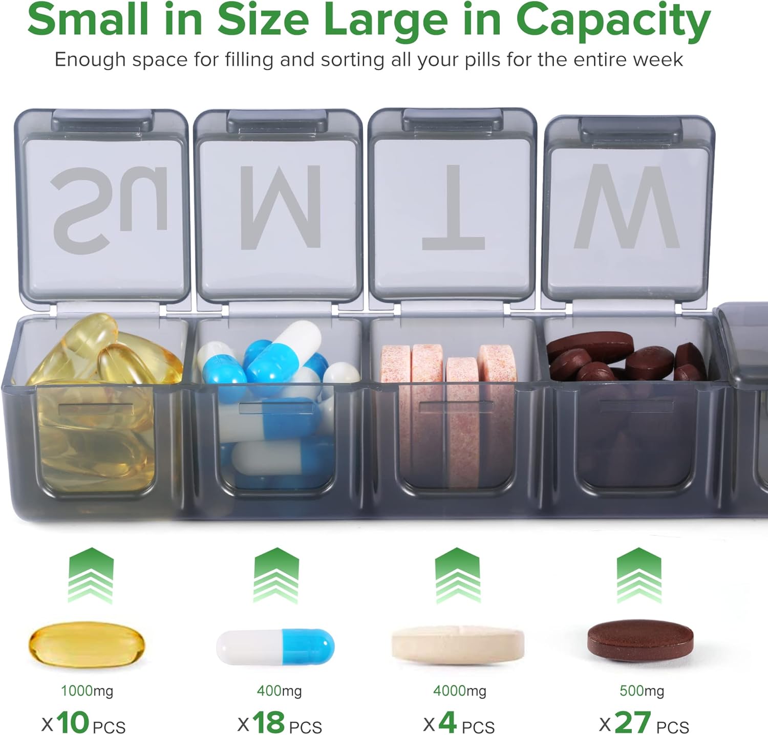 Small in Size, Large in Capacity: Enough space for filling and sorting all your pills for the entire week, every daily slot can hold up to 10 fish oils or 12 large vitamins. Small and portable size, perfect for your travel or on-the-go. Product Size:9.25″x 1.46″x 1.38″. Each Compartment Size:1.3″x 1.3″x 1.1″
