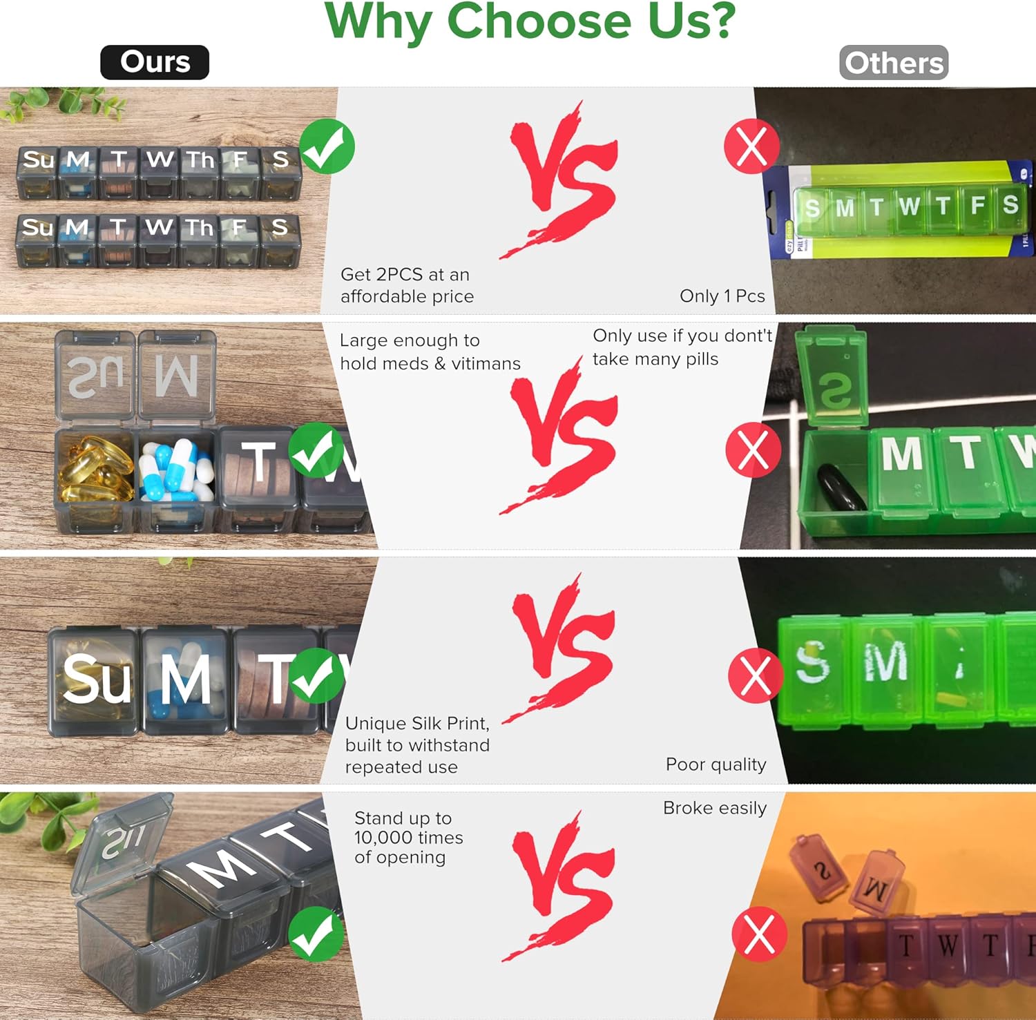 What You Get:2 x Weekly Pill Organizer, 1 x Happy Card, More Functional Pill Boxes Choices, our 12-month Warranty, and Friendly Customer Service.
