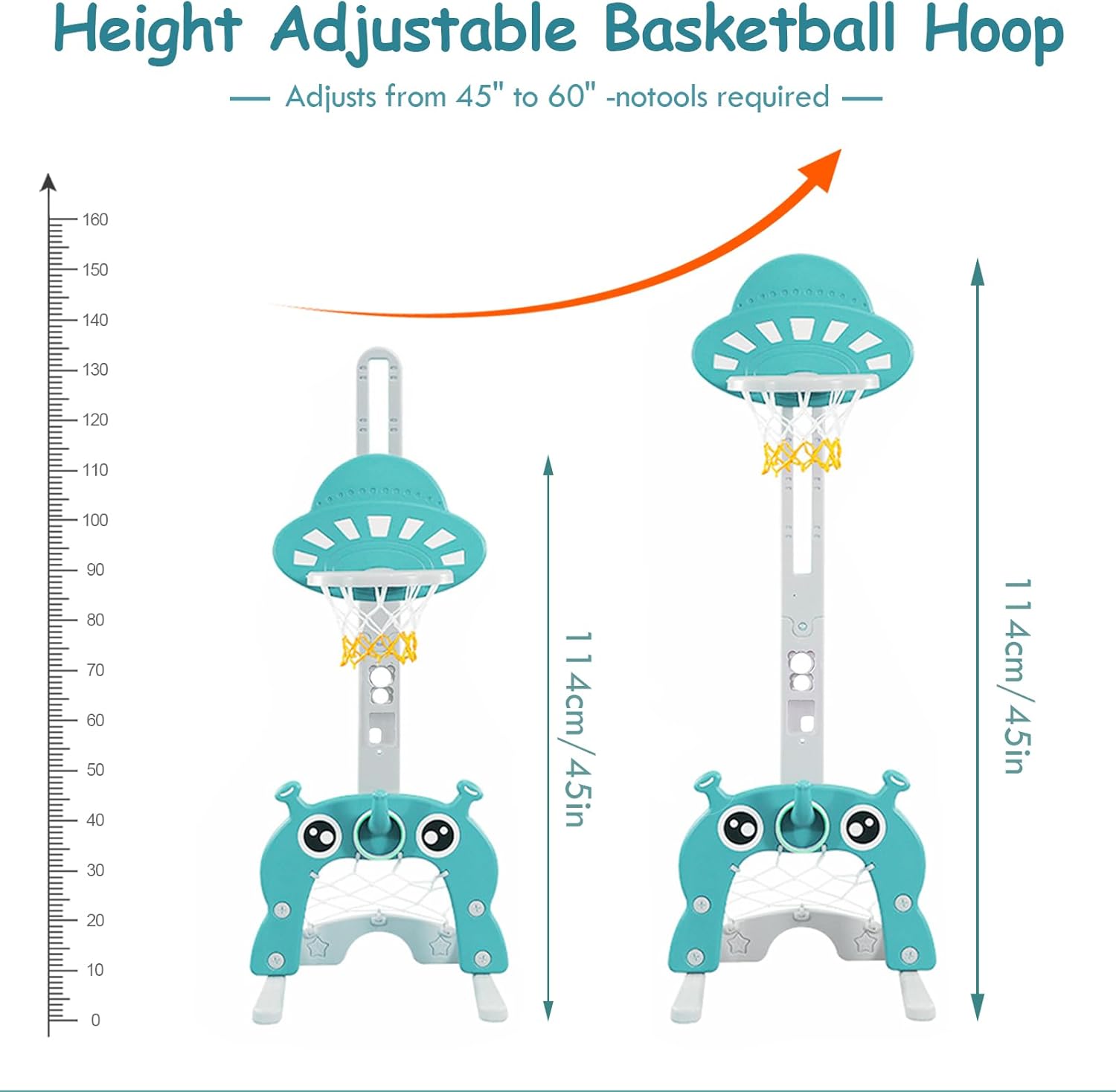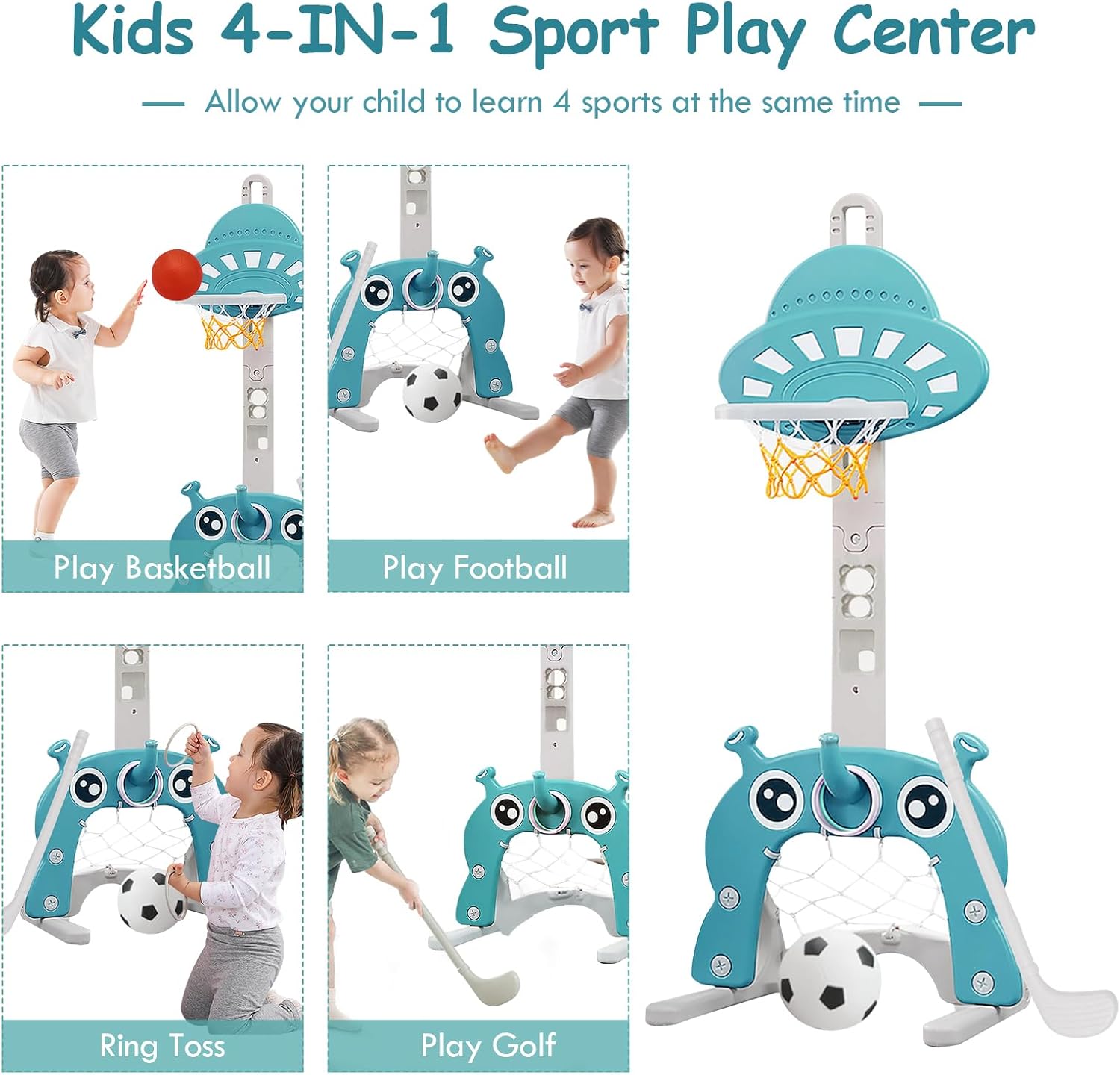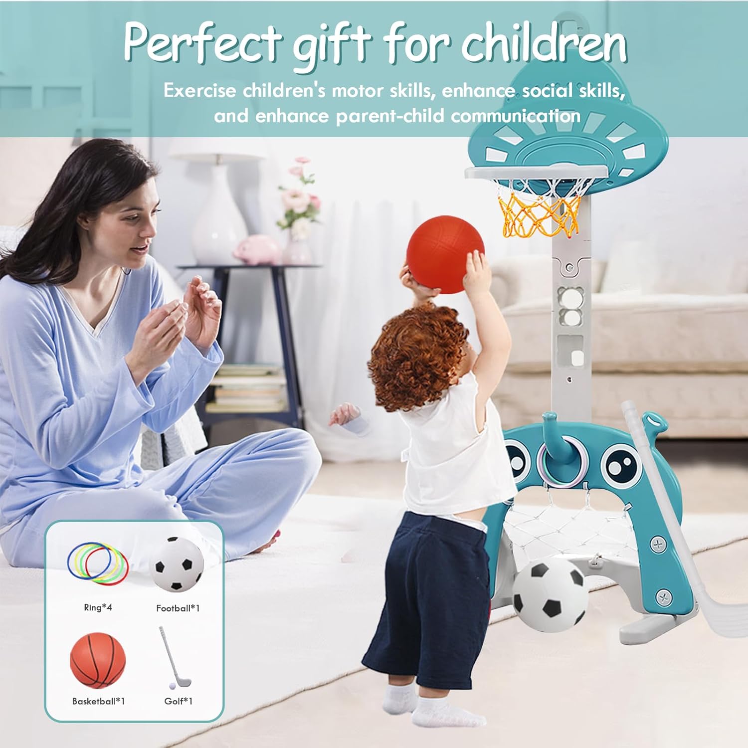 🏀【4-in-1 Basketball Hoop】 This kids basketball hoop has 4 sports to play,golf game, basketball game, soccer goal game and ring toss games. Including 1 basketball, 1 soccer ball, 4 rings, 1 pump, 1 golf ball and golf club.Make children to learn 3 ball sports at the same time and develop motor skills.