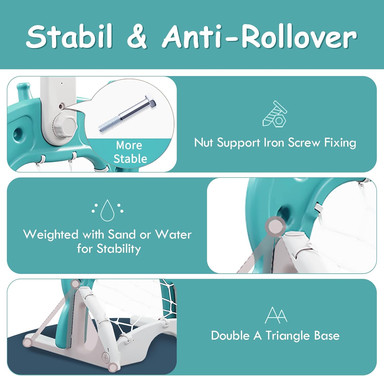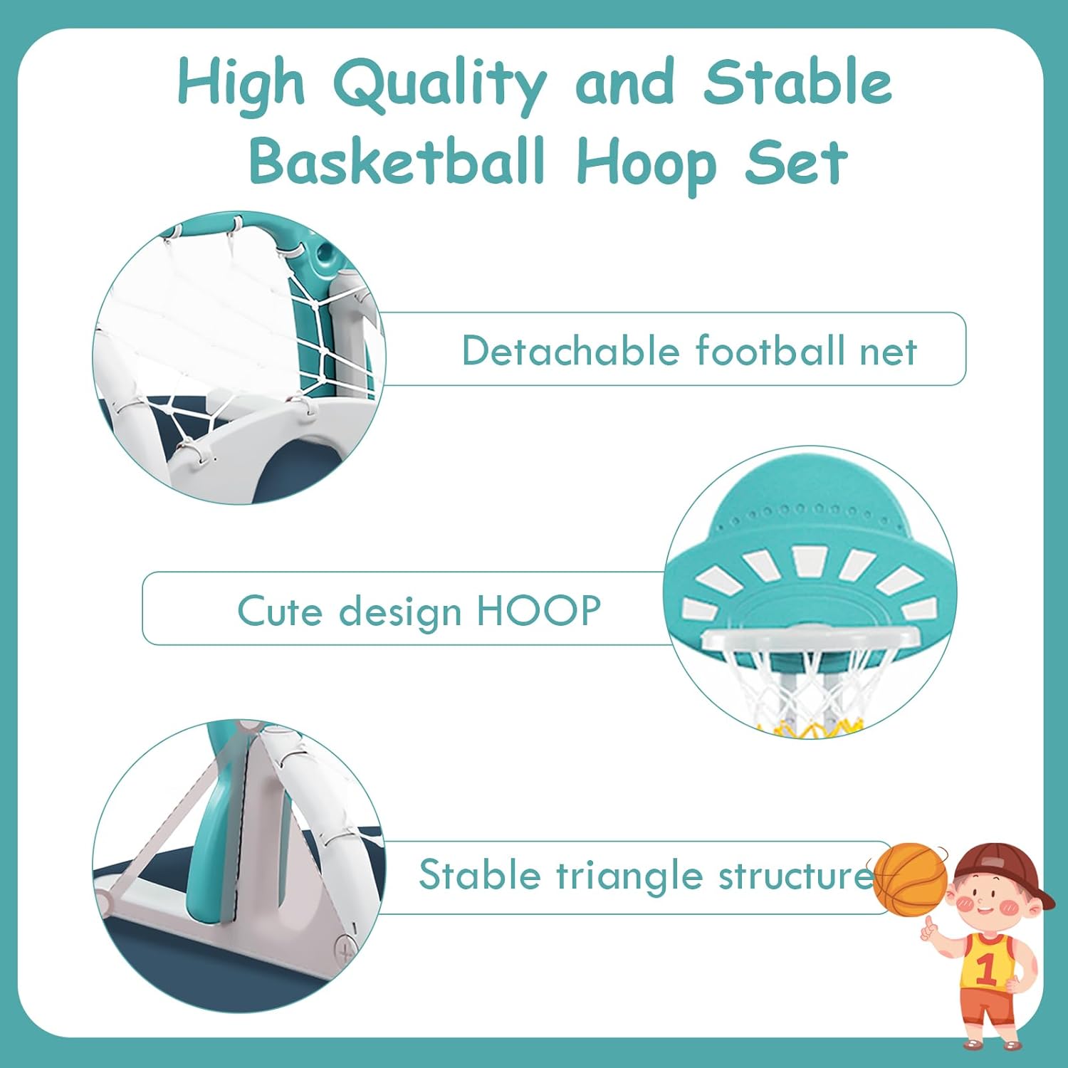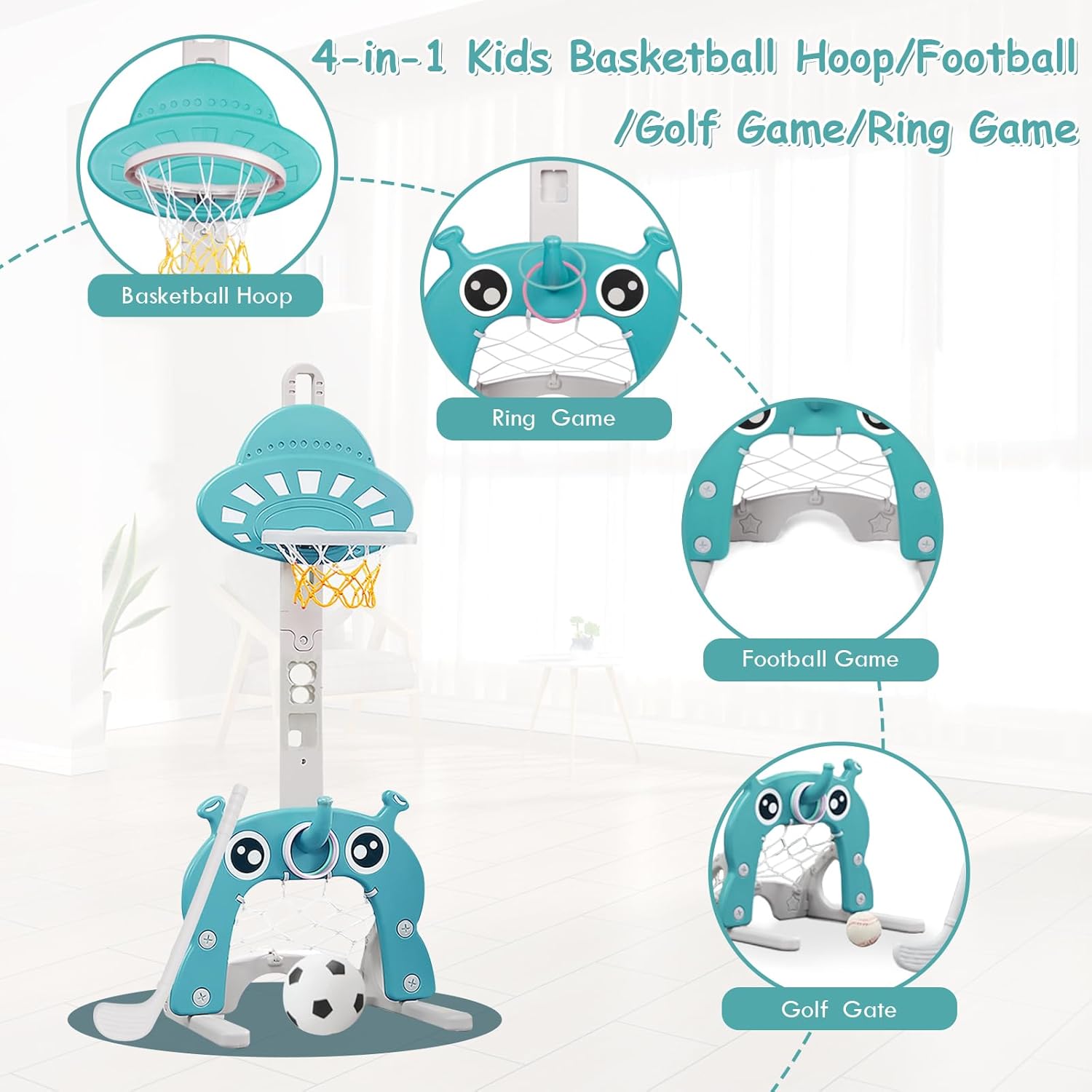 🏀【4-in-1 Basketball Hoop】 This kids basketball hoop has 4 sports to play,golf game, basketball game, soccer goal game and ring toss games. Including 1 basketball, 1 soccer ball, 4 rings, 1 pump, 1 golf ball and golf club.Make children to learn 3 ball sports at the same time and develop motor skills.