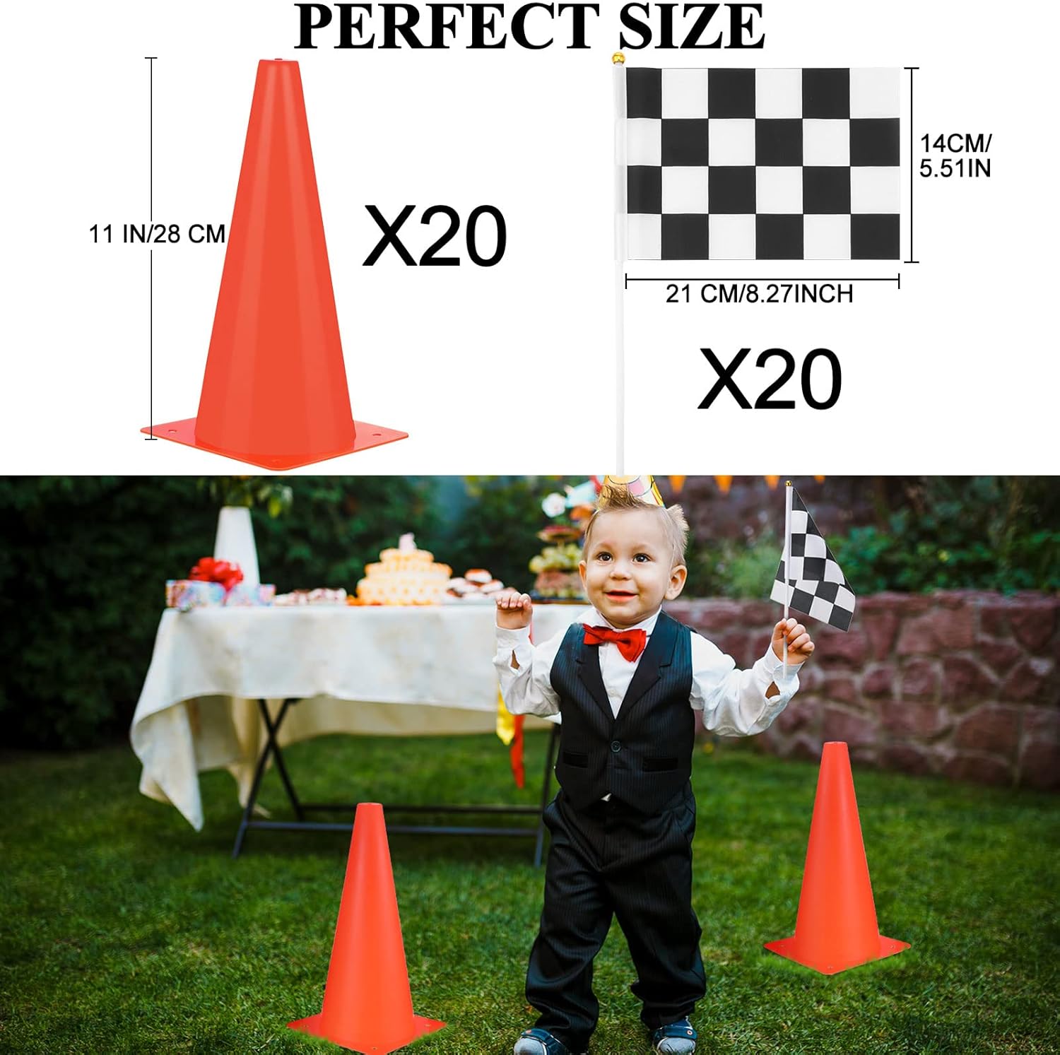 Large Supplies: you will receive 20 pieces of orange cones and 20 pieces of racing flags, enough to meet your daily use, replacement and sharing needs, and they are enough for you to decorate a car themed party
