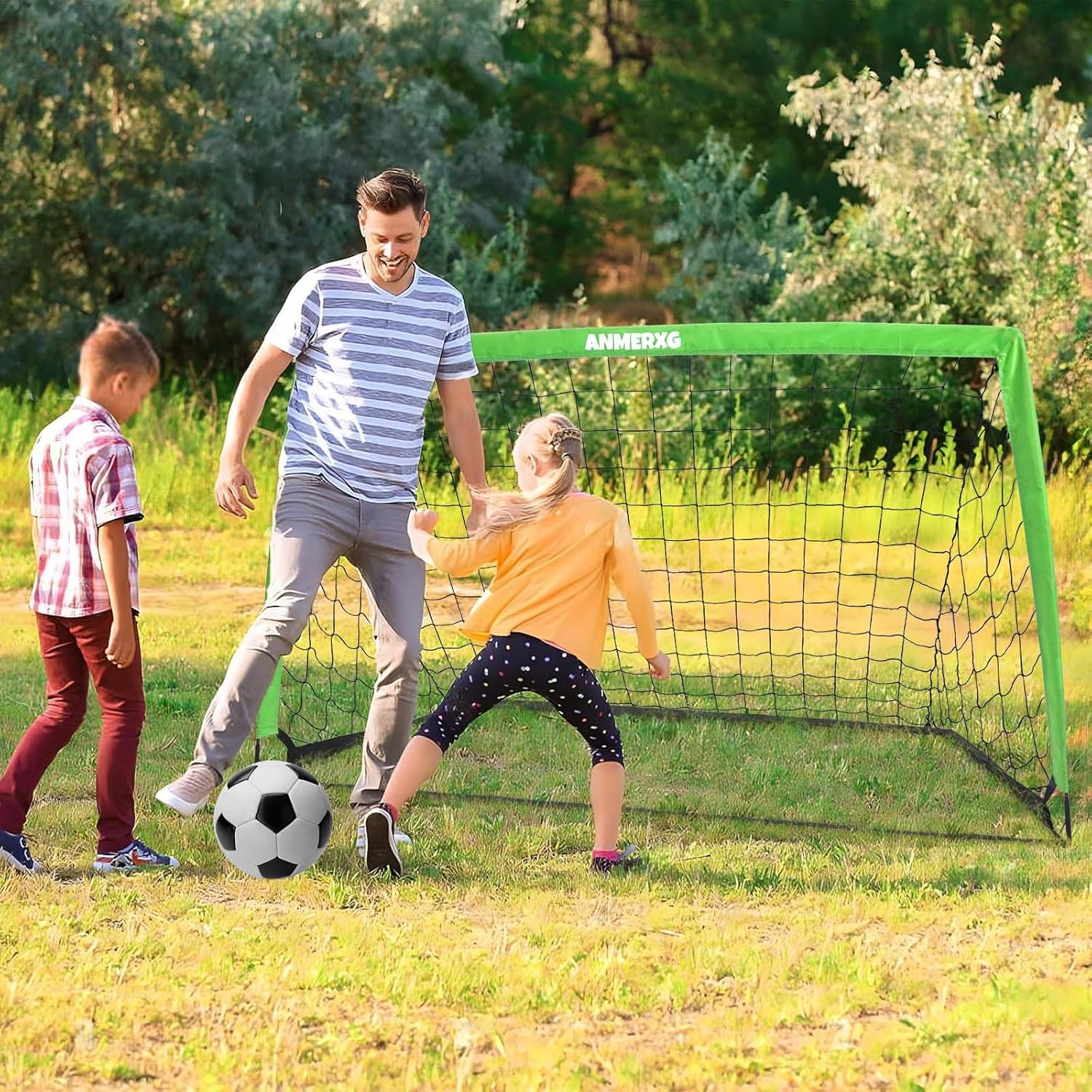 ANMERXG presents a premium 6×4 ft pop-up soccer goal designed for superior quality and durability. Crafted with robust materials, including 420D thickened Oxford cloth, 10MM high-elastic fiberglass poles, and a sturdy 3-layer PE soccer net with reinforced inner bungee cord, these soccer goals ensure all-weather resilience. The set includes a durable TPU standard size 3 soccer ball. Effortless assembly is facilitated by a user-friendly design, making it suitable for kids. Soccer goal for kids ages 3-5 6-10 8-12 12-14, this soccer net set promotes teamwork, motor skills, and coordination development, offering endless hours of entertainment for players of all ages and skill levels.