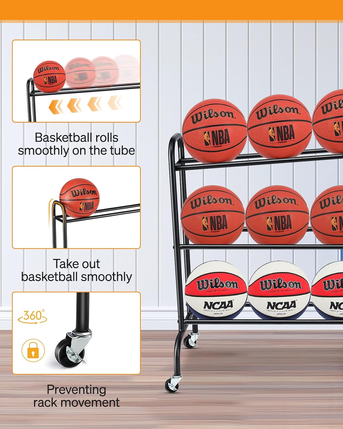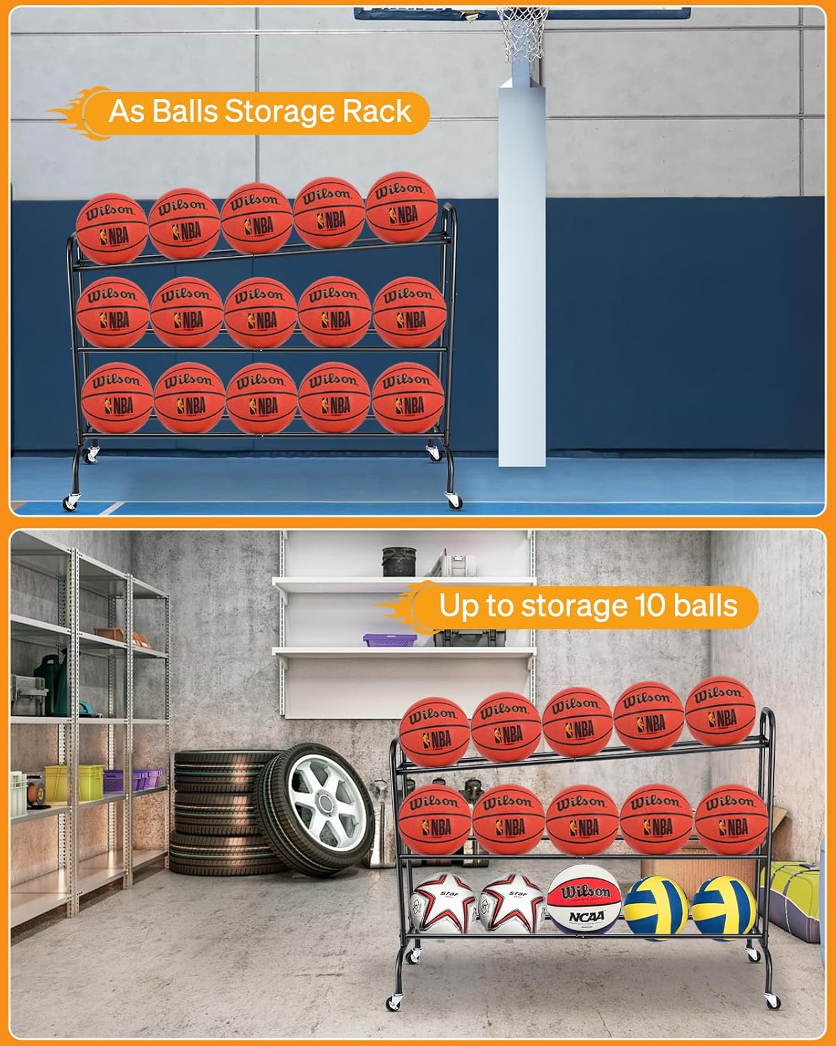 REMOVABLE & IDEAL FOR MULTI-OCCASIONS : The ball racks can move it easily. Equipped with 4 sturdy multi-directional wheels (including 2 lockable). It is ideal for the garage, home, school, Basketball training ground and more other places.