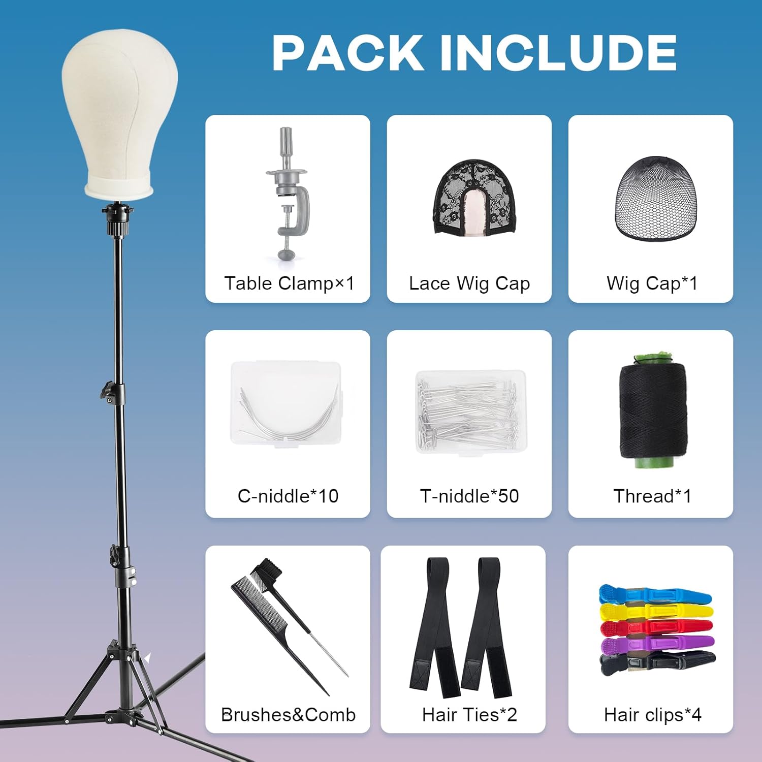 Comprehensive Accessories: Includes a canvas head, wig stand tripod and table clamp, net&lace wig caps, sewing needle set, hair edge brushes&rat tail comb and alligator Hair Clips for wig making beginner, professional advancement set. Gift box packaging, can be a gift.