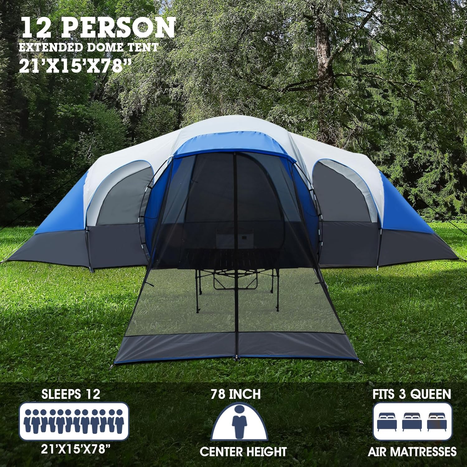 12 Person Large Camping Tent with Screen Porch, Waterproof Windproof Family Tent with Rainfly, Portable with Carry Bag, Perfect for Backpacking or Family Gathering