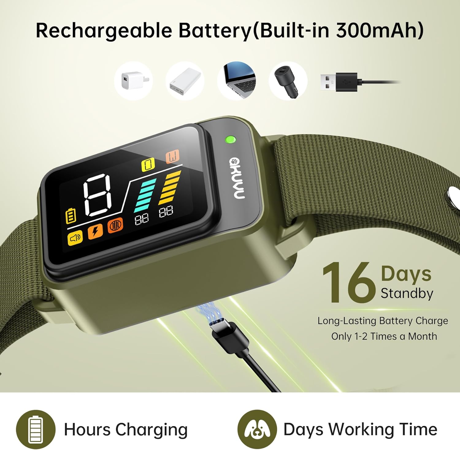 【Quick Charging & Protection Mode】Bark collars for dogs charge in just 2 hours and can last up to 15-20 days. adopts an intuitive large LED color interface, which displays richer content and has a strong sense of technology. Effectively eliminates annoying barking at night or when you’re away, creating a peaceful environment for your family and neighbors. AKUVU Dog Bark Collar features an intelligent protection mode, automatically pausing for 1 minute after 6 stimulation.