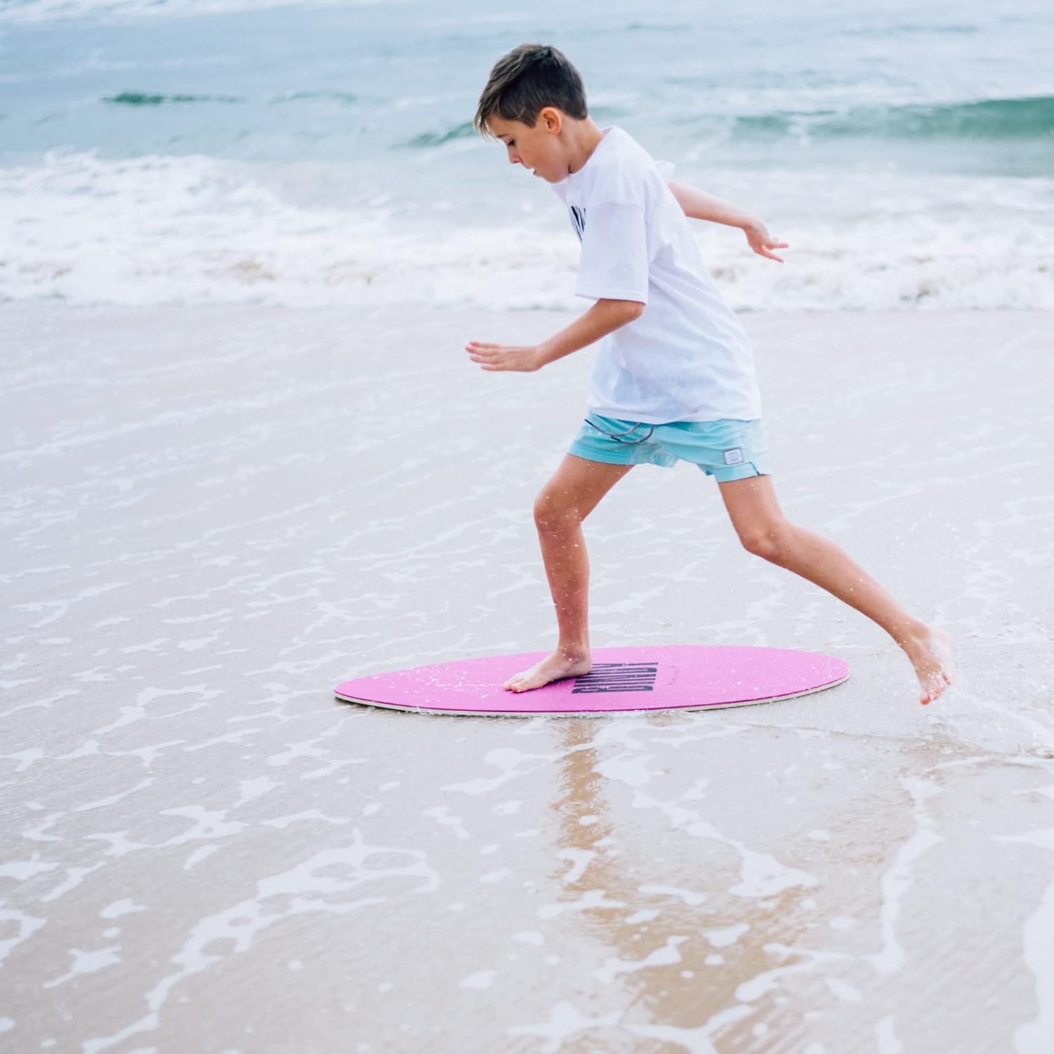 Skimboards are designed to skim along the shallow water at the edge of the beach using your own energy. Generally, people add wax to the board so that they don’t slip off. Our board comes with EVA grip (and a board bag!) so there’s no need for any extras.