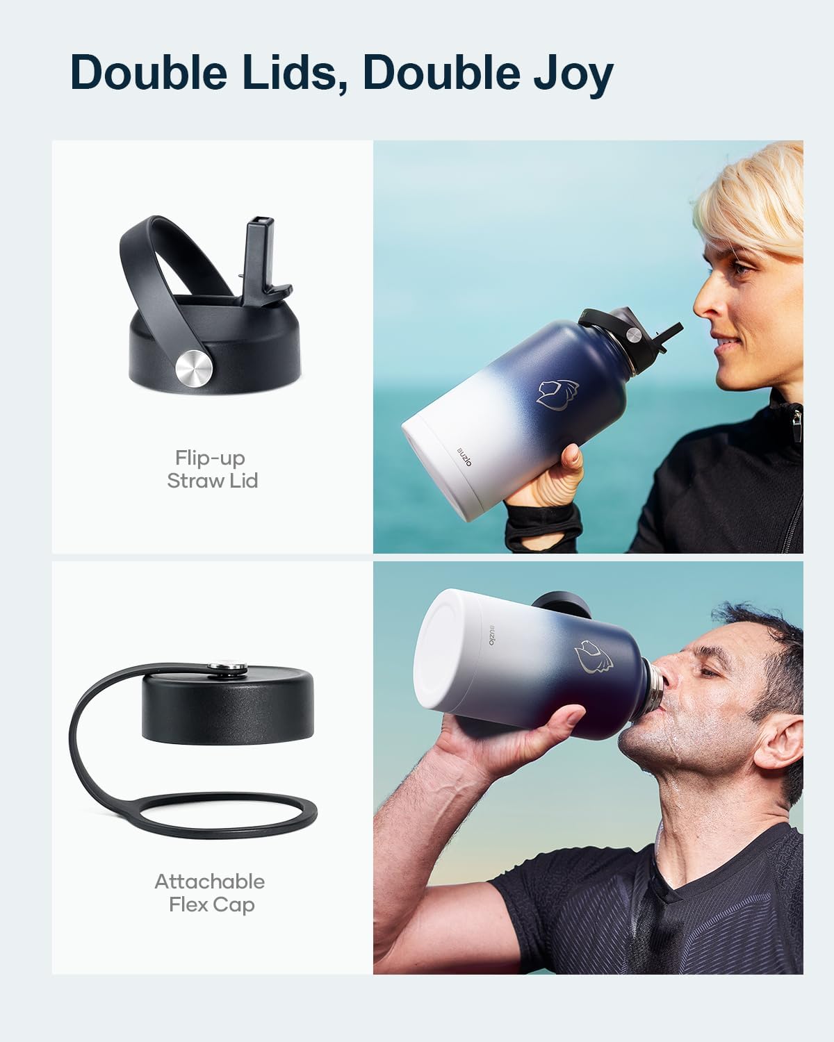 2 Caps Pack: This 64 oz stainless steel water bottle comes with straw lid and flex cap, the flex cap is perfect for the beach, camping and hiking, while the straw lid is suitable for cycling and road trip