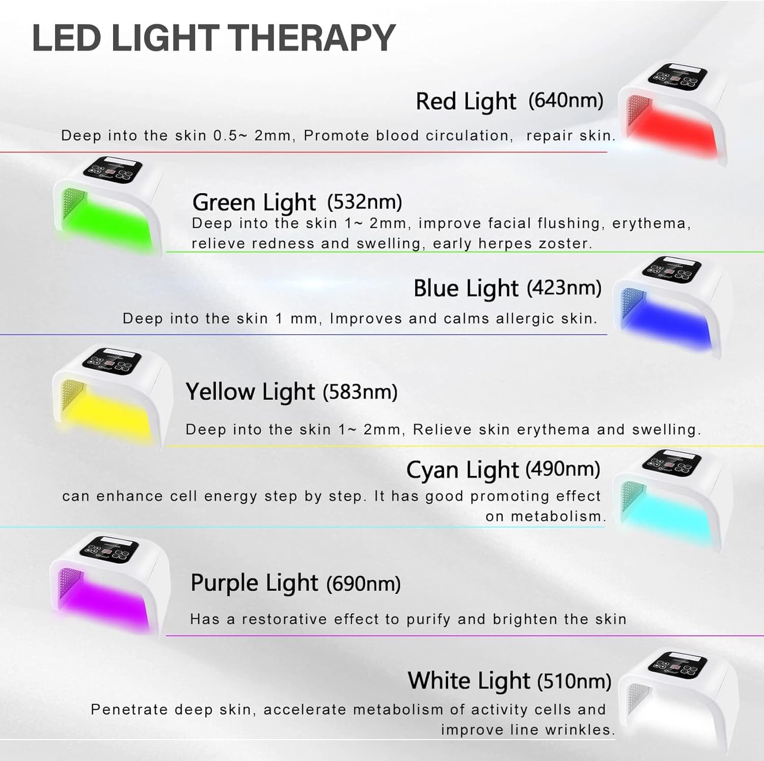 【7 in 1 Light Therapy for Face】Red, green, blue, purple, cyan, yellow and white. 7 shades to suit your skin’s various needs.