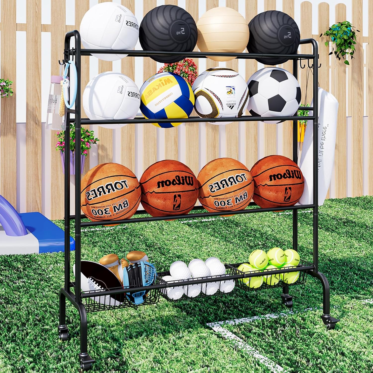 Four-tier ball storage rack: Each tier can placed 4 standard basketball, football, or volleyball, and two detachable metal frames at the bottom are used to store small types of balls.