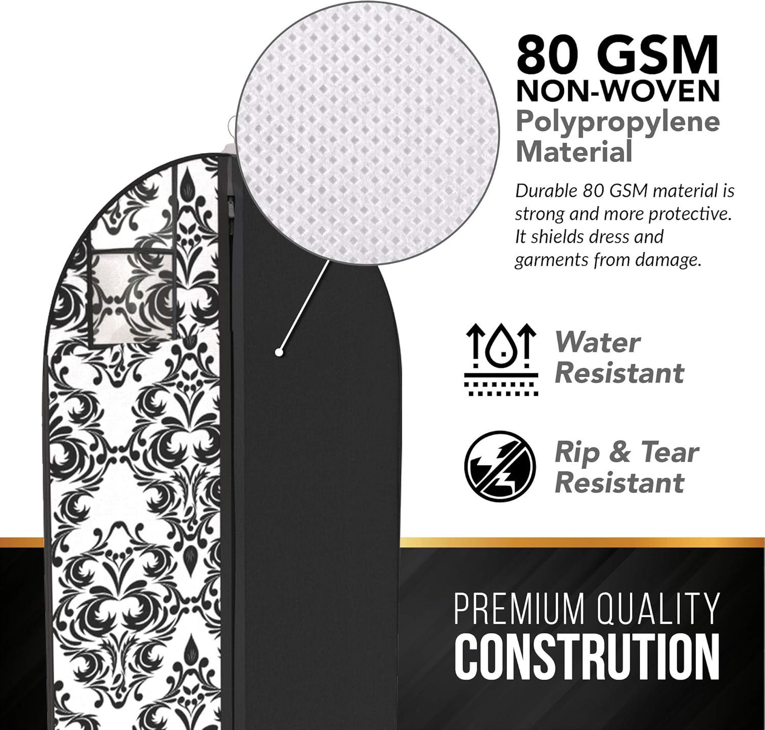With Your Bag’s Long Garment Travel Bags and Garment Covers your suits, dresses, gowns and other garments can be easily transported or stored while remaining in pristine condition! Make sure your outfit is ready to be worn wrinkle and damage free whenever you need it.About The Product: Non-Woven 80 GSM 54″ X 24″ Easy To Use Zipper Perfect For Everyday Use & Special Occasions Men’s and Women’s Designs For Suits, Tuxedos, Skirts, Blouses & Tops, Gowns, Dresses and More! Large ID WindowCOLORS & STYLES: Black White Fuchsia Tiffany Blue Black & White DamaskOur garment covers are designed to hold your garments and keep them in pristine conditions for everyday use and special occasions, such as business meetings, special ceremonies and formal events like graduations, proms and weddings. Our bags are flexible and will fit the clothing and storage needs of most people. It is made from non-woven 80 GSM and is incredibly lightweight, durable and resistant to wear and tear with prolonged use.LARGE ID WINDOWS!Some bags have a transparent pocket window on the outside to see what is inside the bags, other styles have a hanging ID window to insert labels or hold small items. This makes the bags great for closet storage and organization, and it is also perfect for stores, tailors and other locations with many garments from numerous customers.Get one of our garment bags today and transport your garments in style!At Your Bags we’re committed to providing quality products that will have you traveling in style. If for any reason you’re not completely satisfied, contact us so we can be of assistance. Get yours today and experience the quality for yourself.