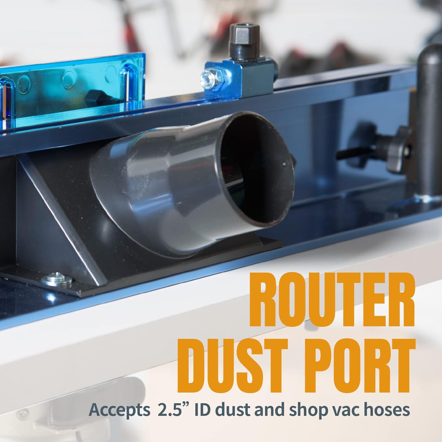 BONUS FEATURES: The fence is a rigid aluminum extrusion, independent fences and jointing rods are provided for vertical jointer use, the stand is rugged heavy duty steel with vibration-dampening rubber feet, the work surface is impact-resistant, bottom-up levelers have 8 adjustable points of contact, to eliminate insert plate hang-ups. The insert plate is premarked with the most popular router base hole patterns