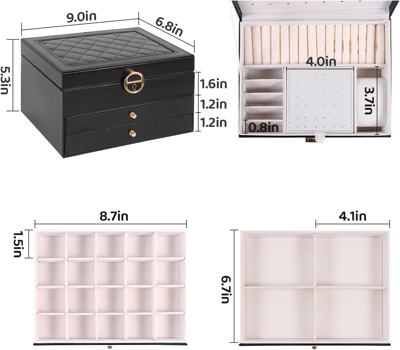Abundant Dedicated Storage: This 2 layers jewelry organizer box helps to organize all your treasured accessories—hooks on the lid for long necklaces, and multiple sections for earrings, rings, bracelets.