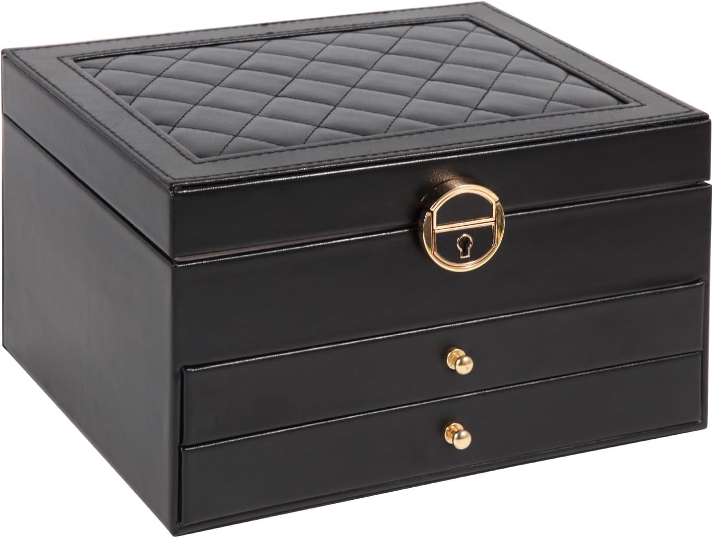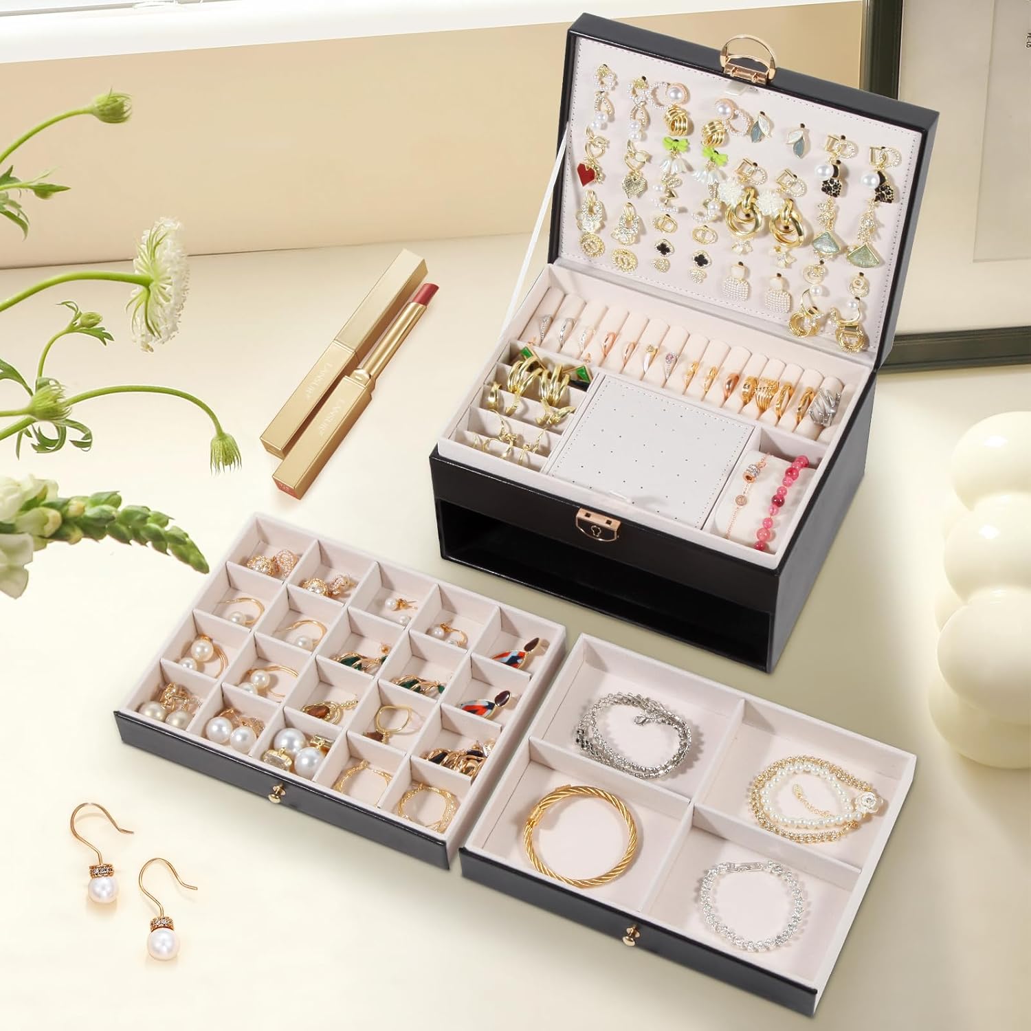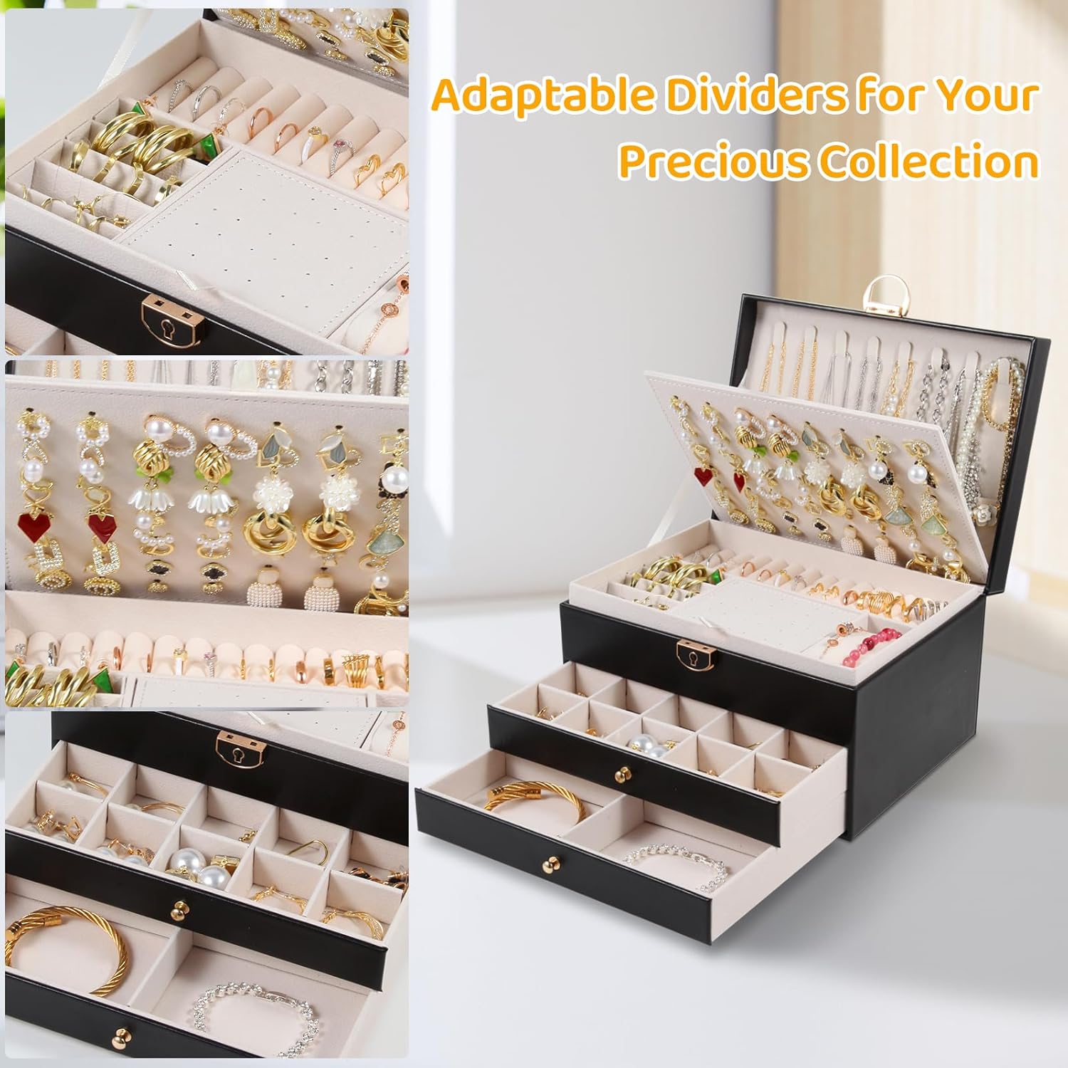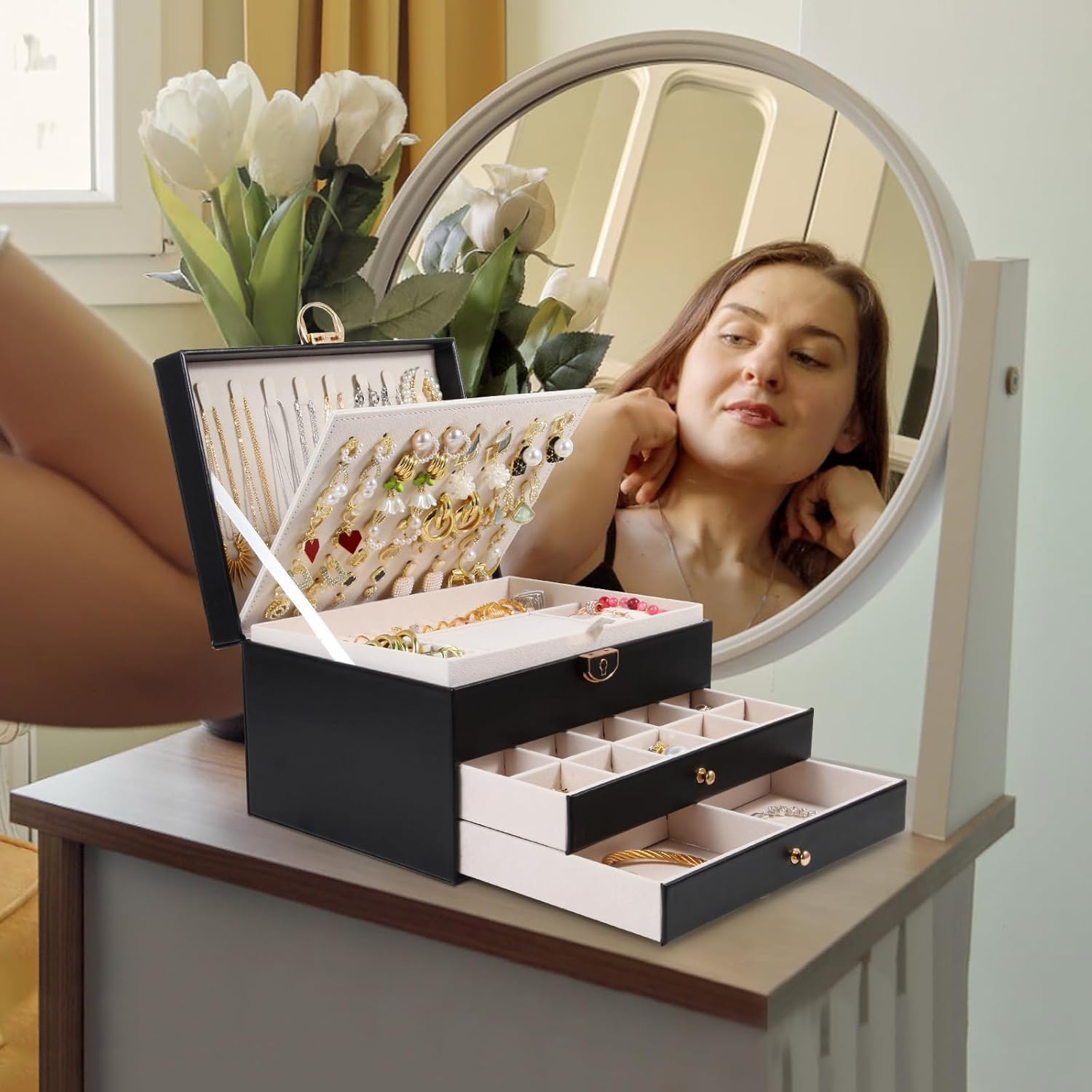 Jewelry Box for Women Earring Holder Jewelry Organizer 3 Layers Jewelry Boxes & Organizers with Lock (Black)