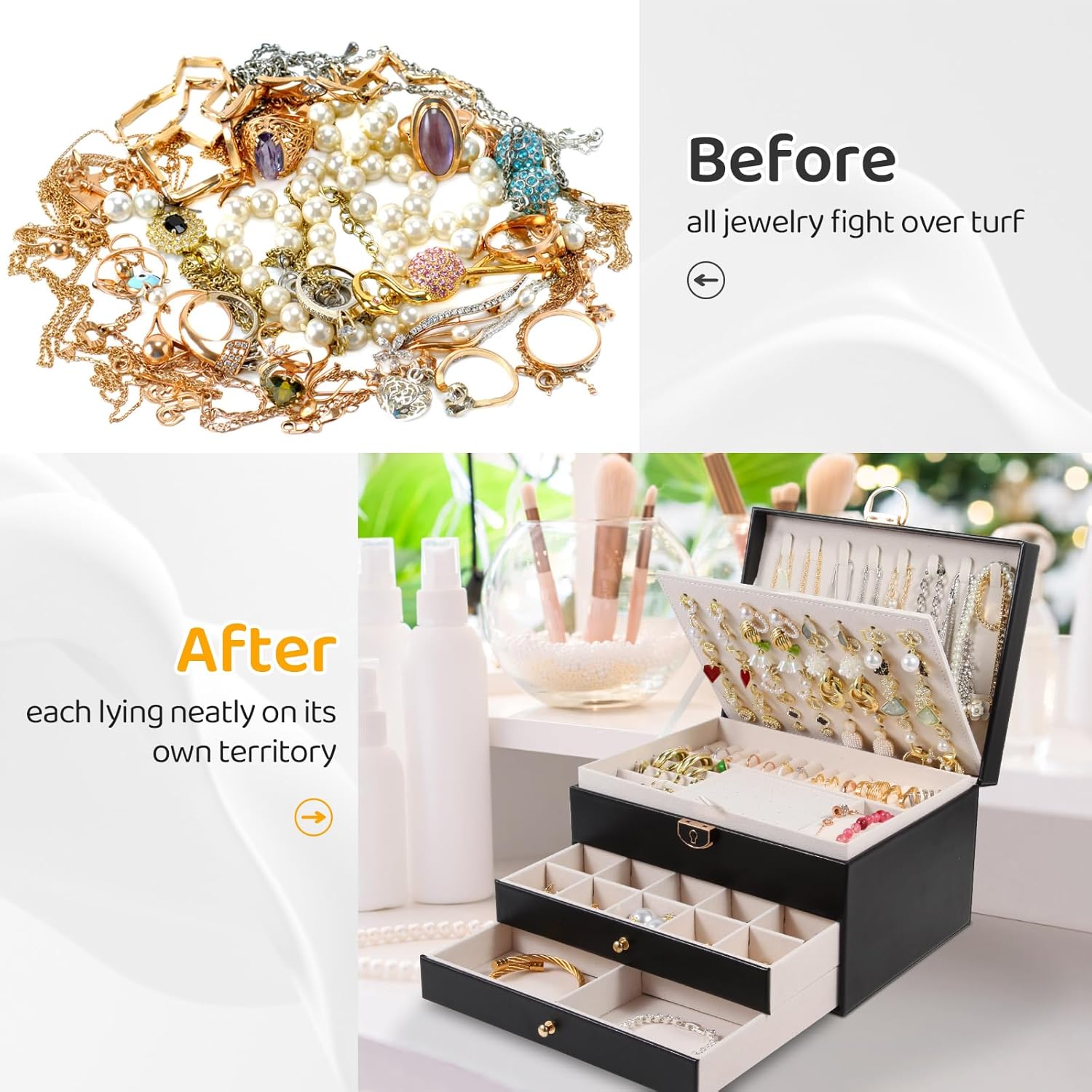 Space Saving Jewelry Holder: This jewelry storage box the size is 23x17x10.5cm when closed. all your jewelry will be organized and easy to access. From then on, you have a bright dressing table that saves a lot of space and makes your room look more tidy and elegance. Moreover, the classification design of our travel case for jewlery makes your jewelry clear at a glance, reducing the time for searching.
