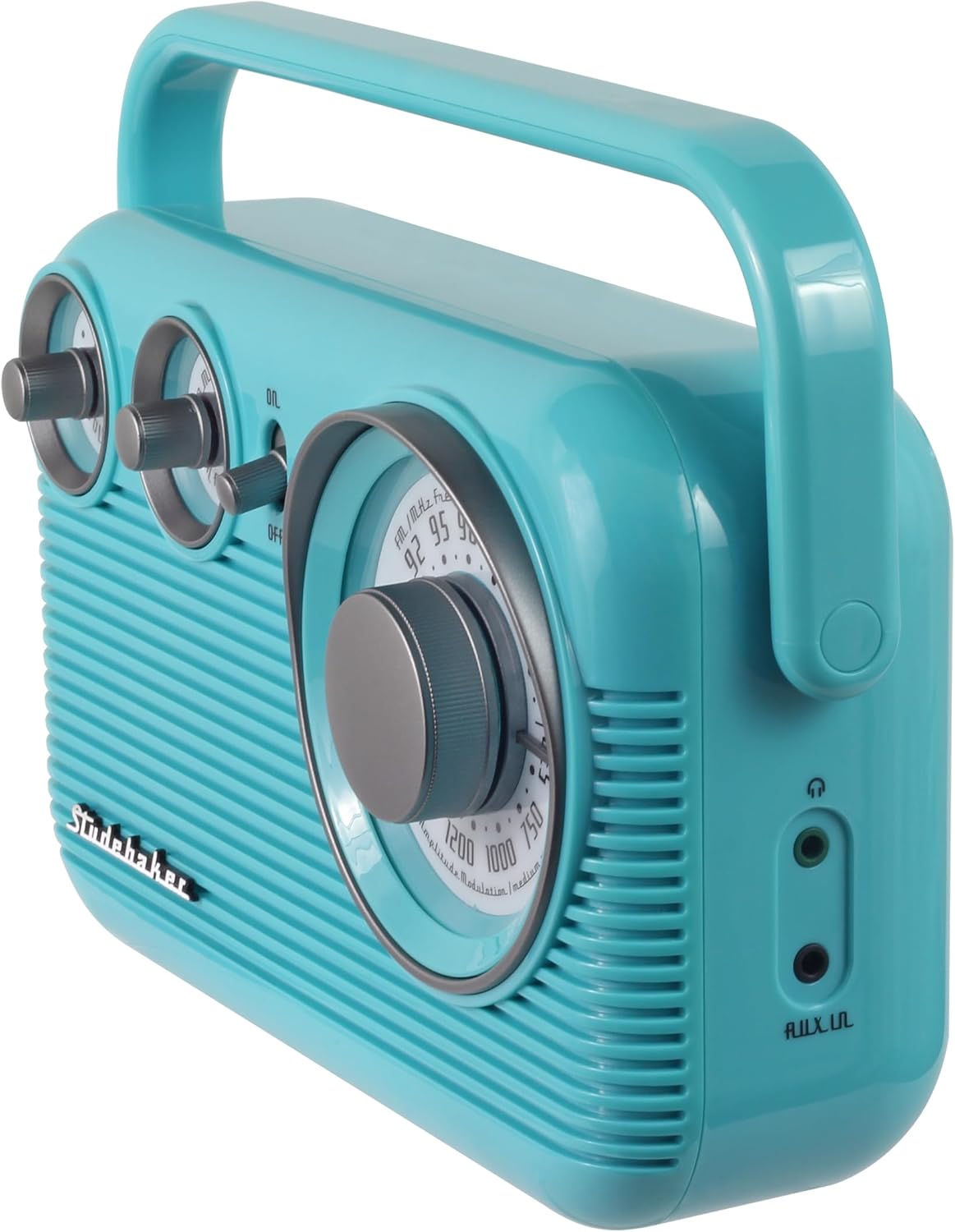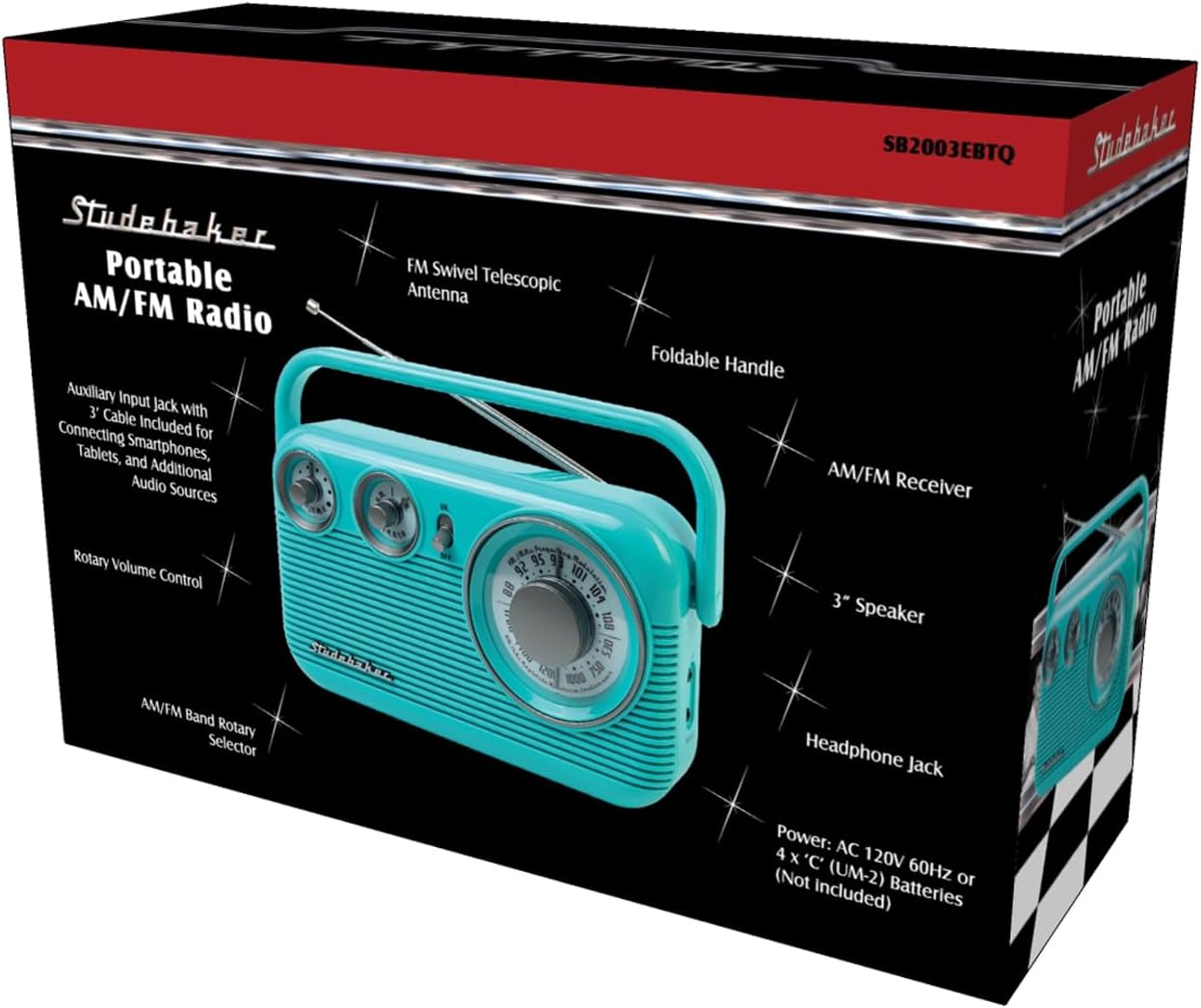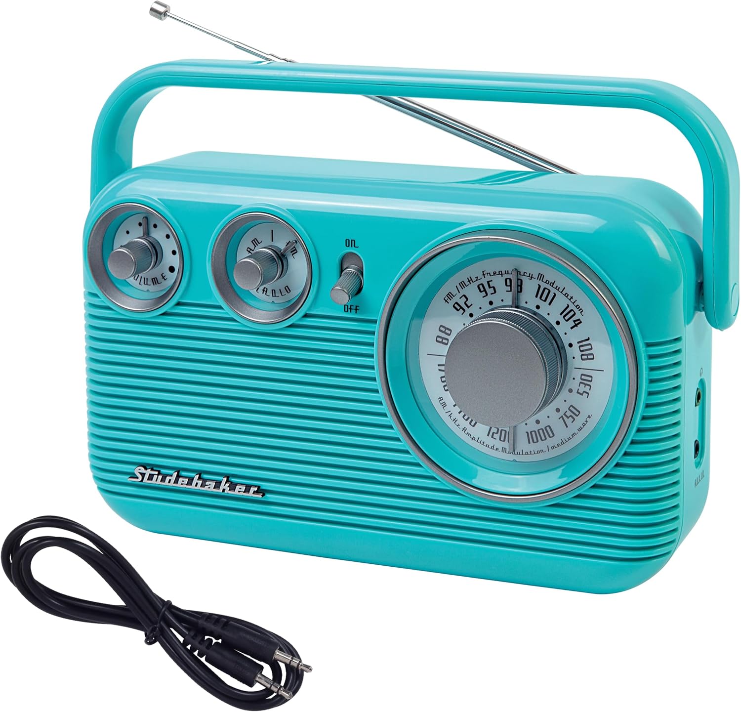 Studebaker SB2003 Retro Portable AM FM Radio | Built in Speaker | AC Powered/Battery | Aux-in Cable (Bundle) (Turquoise)