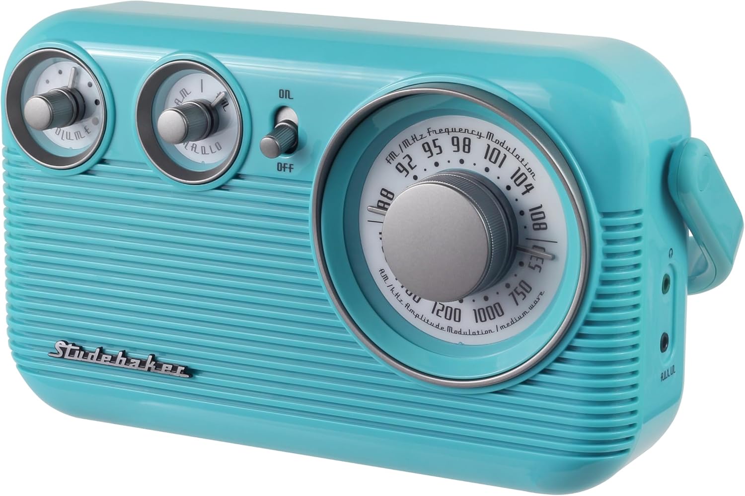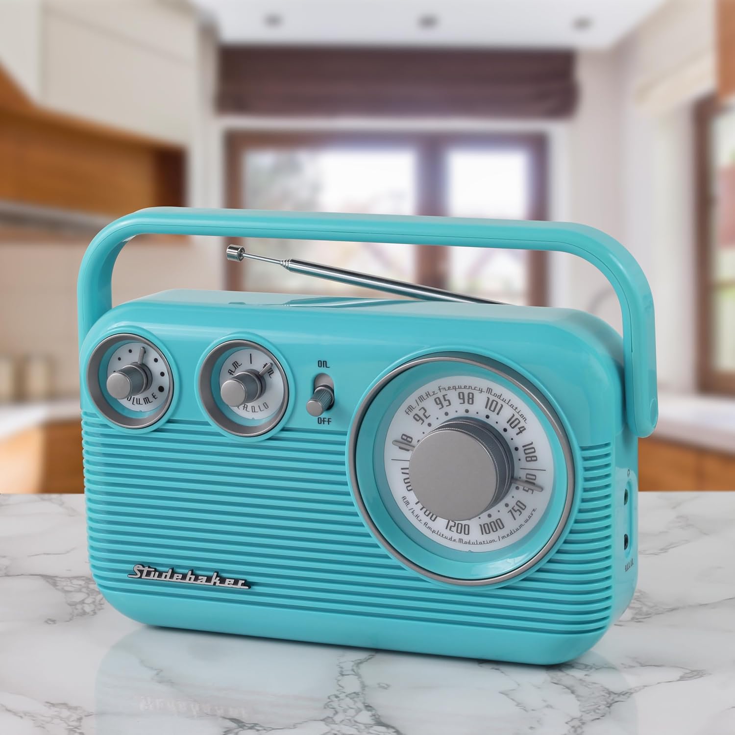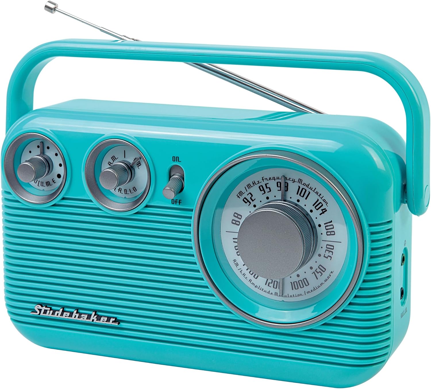 Studebaker SB2003 Retro Portable AM FM Radio | Built in Speaker | AC Powered/Battery | Aux-in Cable (Bundle) (Turquoise)