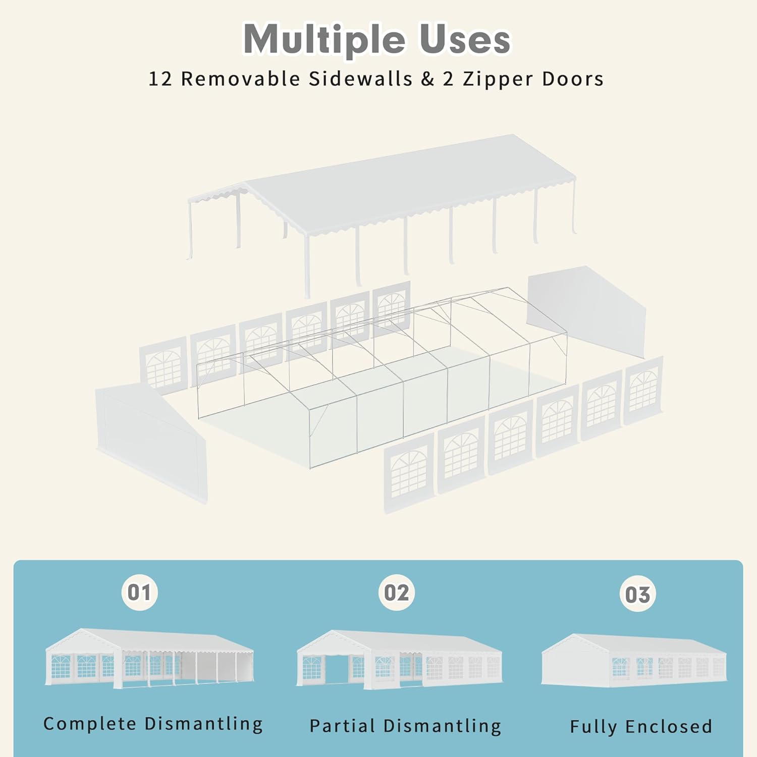 ✔️【Multi-purpose Use】Overall size: 20’Wx40’Lx10’H, door size: 16.4’Wx6.6’H. This gazebo is a multi-purpose shelter that is the perfect tent for commercial or recreational purposes such as weddings, parties, events, and more. The spacious interior makes this tent also suitable as a carport.