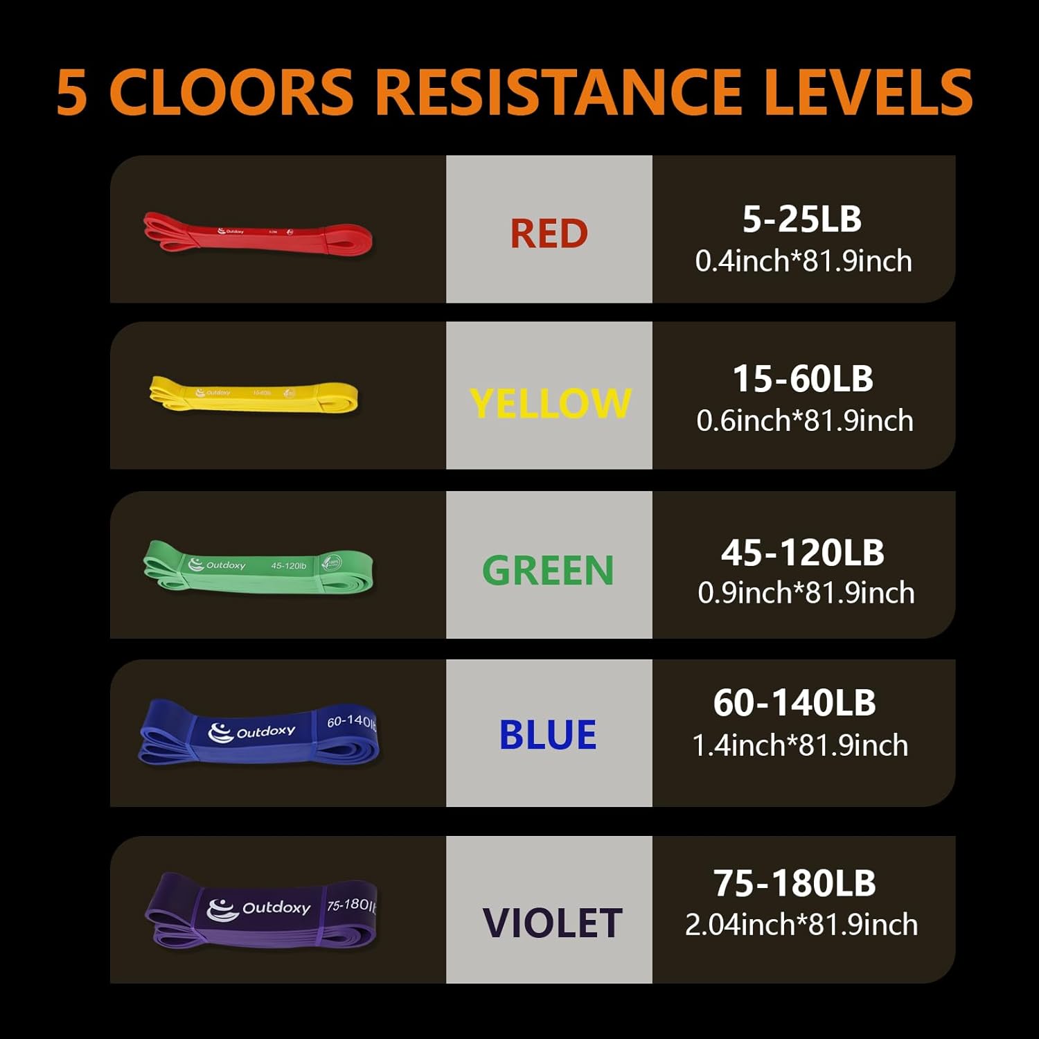 Multifunctional and Wide Applications: There are five different levels of workout bands resistance. Red(5-25lb), Yellow(15-60lb), Green(45-120lb), Blue(60-140lb), Violet(75-180lb). You can choose the corresponding workout bands according to your weight and the exercise you want to do.