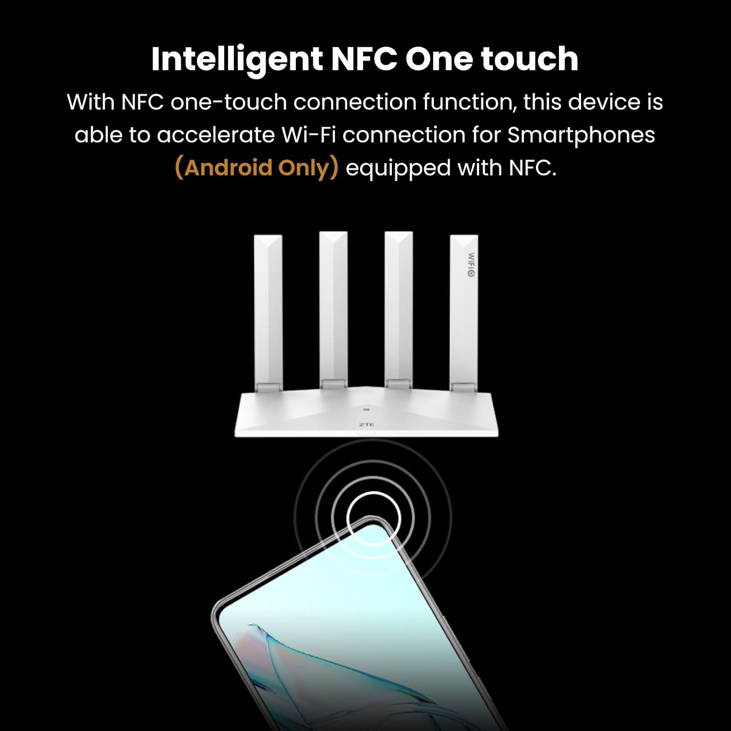 【Easy Mesh & NFC Connection】To enhance wifi accessibility and convenience, this ZTE wifi 6 router supports Easy Mesh networking technology and can be easily extended with just a single network ID (SSID), providing seamless connections and coverage across multiple devices and rooms. Plus, users with Android Smartphones (NOT IOS) equipped with NFC can leverage the AX3000 Pro’s Intelligent NFC one-touch connection function for an accelerated Wi-Fi connection and experience.