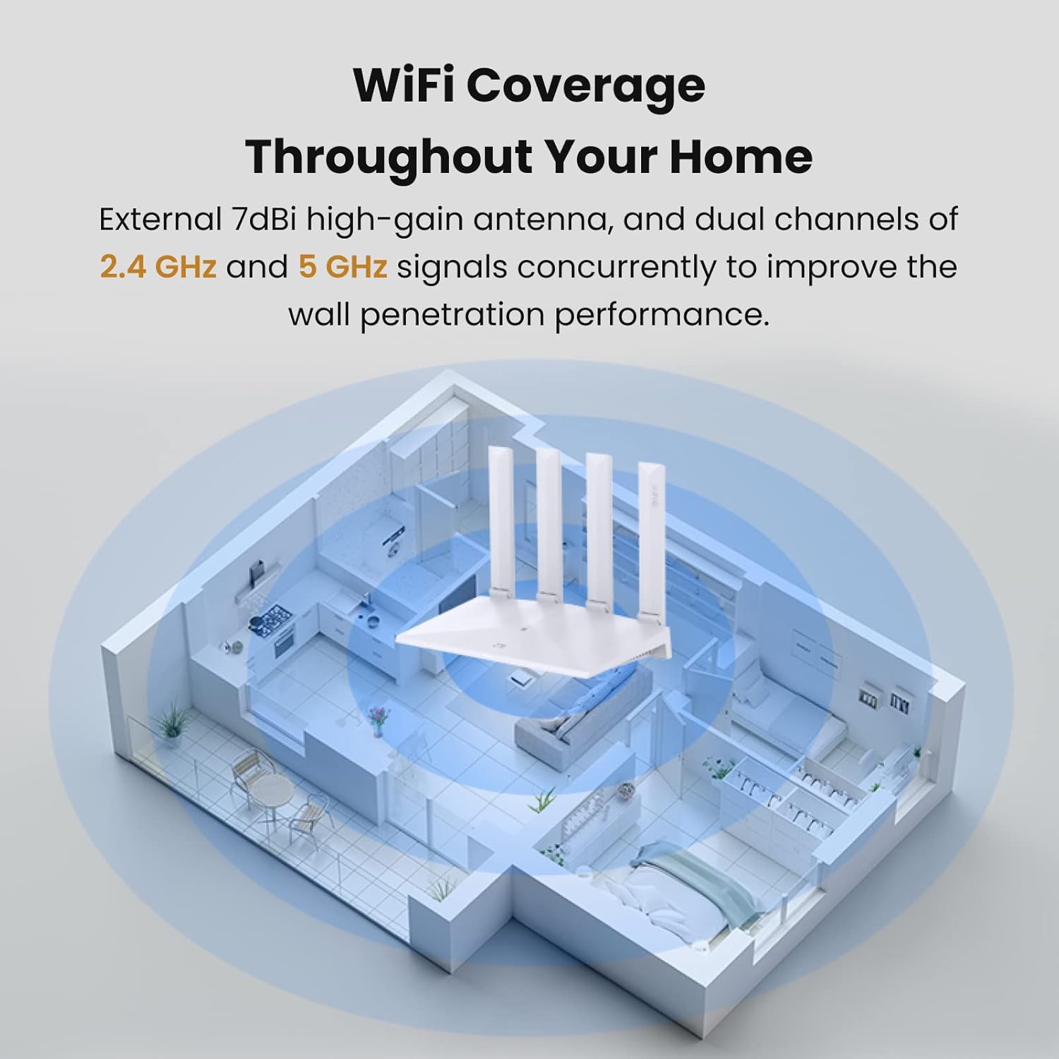 【WiFi Throughout Your Entire Home】By combining four 7dBi high-gain antennae with dual channels of both 2.4 GHz and 5 GHz frequency bands, this high-speed dual band Router enjoys improved wall penetration and enables a wide-reaching coverage across your home for up to 1500 sq. ft. Additionally, with the QoS intelligent function, this gigabit router can intelligently allocate bandwidth according to User Access Devices, thus facilitating intelligent rate allocation of panoramic users and devices.