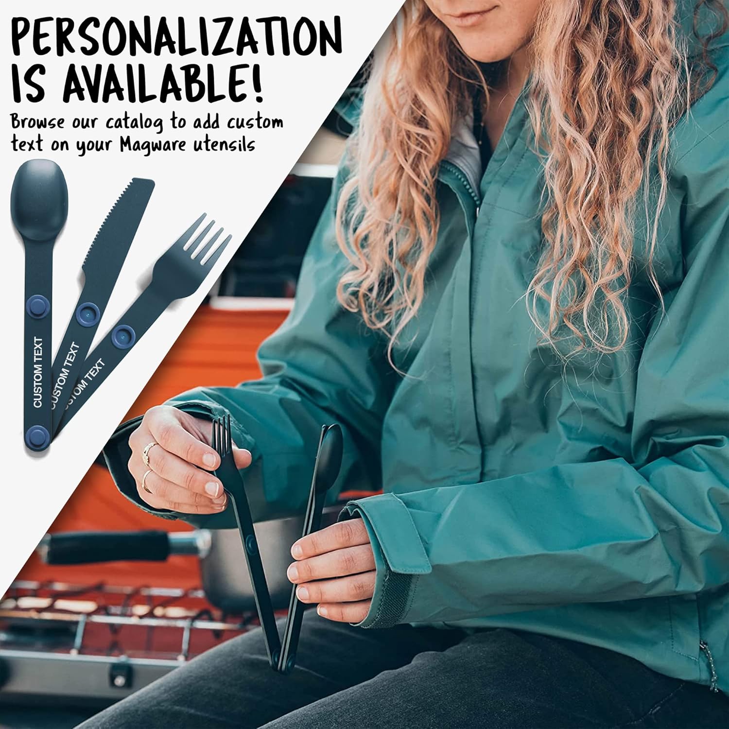 ✔ CONNECT MAGNETICALLY: Embedded magnets allow MAGWARE silverware sets to connect tightly together for secure packing and organized storage. This allows you to join as many camping cutlery kits together as you wish. Take as many sets as needed for the family in one tidy bundle. No more hunting through drawers for that one knife, fork, or spoon that went missing from your three-piece kit.