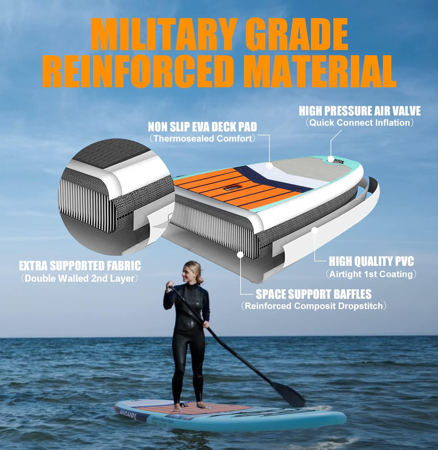 【Extra Wide Stable Design And Good Maneuverability】The extra wide SUP design is easy for beginners to stand up and keep balance. The triple bottom balance SUP fins and the paddle board sporty shape also allow for a fast tracking easy steering experience which is similar to a rigid surfboard. It is an all round stand up paddle board for adults, teens, youth with pets of all skill levels.
