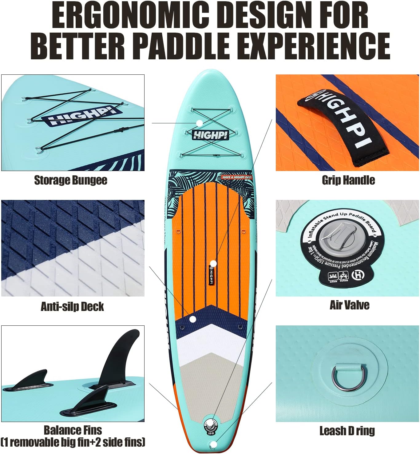 【Full Accessories Including Floating Paddle Dry Bag】HIGHPI inflatable sup comes with everything you need to start paddle board trip: 10’6” stand up paddle board, collapsible length adjustable alloy floating paddle which will never sink, double action hand pump with psi gauge, 1 big removable fin for better balance, ankle safety leash, 5L water proof dry bag for essentials such as cell phone and keys, detailed sup manual, repair kit and a big comfortable sup backpack to hold everything.