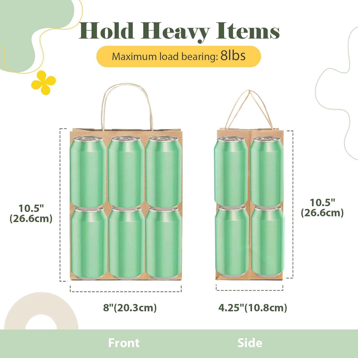 Sturdy and Durable Paper Bags: Each kraft paper bag is 0.15mm thick, more durable than 0.11mm thick of generic craft bags .The reinforced bottom and perfectly glued handle provide extra support. The biggest capacity is 8 lbs.