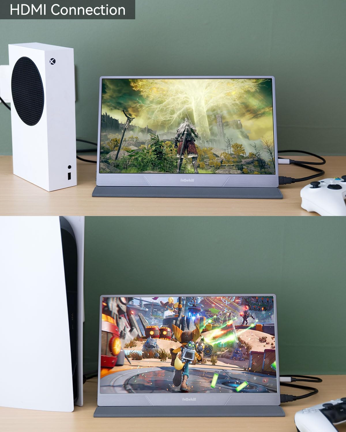 [Wide device compatibility] The F15NA portable monitor is particularly suitable for gaming and video entertainment. They can easily connect to popular gaming consoles like PS5, Xbox, Nintendo Switch, and Steam Deck. Additionally, both models can serve as extended screens for laptops or displays for mini PCs.