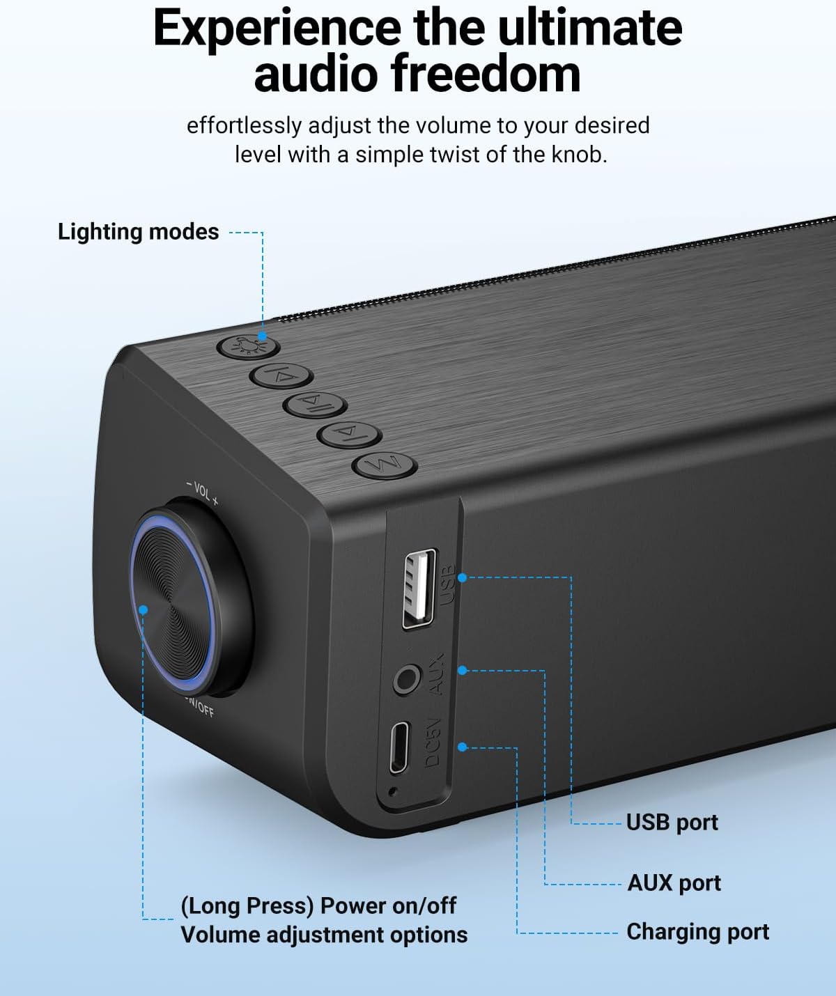 𝗖𝗼𝗿𝗱 𝗼𝗿 𝗕𝗮𝘁𝘁𝗲𝗿𝘆 𝗗𝘂𝗮𝗹 𝗣𝗼𝘄𝗲𝗿𝗲𝗱: Elevate your gaming and movie experience with our Computer Sound bar Speaker featuring multiple dynamic lighting effects, Bluetooth and 3.5mm audio input, and flexible Type C cord or battery-powered options.