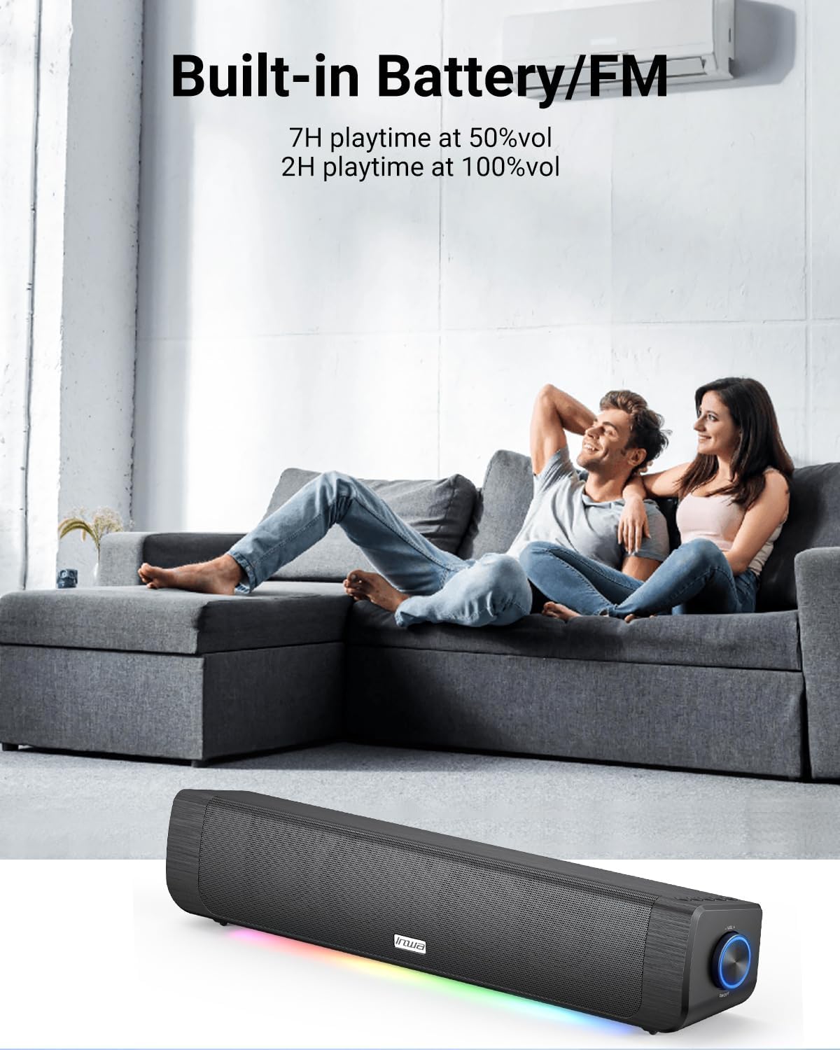 𝗣𝗼𝗿𝘁𝗮𝗯𝗹𝗲 𝗦𝗽𝗲𝗮𝗸𝗲𝗿𝘀 𝘄𝗶𝘁𝗵 𝗕𝘂𝗶𝗹𝘁 𝗶𝗻 𝗙𝗠: Thanks to the built-in 2000mAh battery, we’ve made this computer soundbar portable, allowing you to effortlessly take it from your desktop to the living room, or even the backyard. What’s more, this computer speaker features a built-in FM radio, offering you even more entertainment from your favorite FM radio channel.