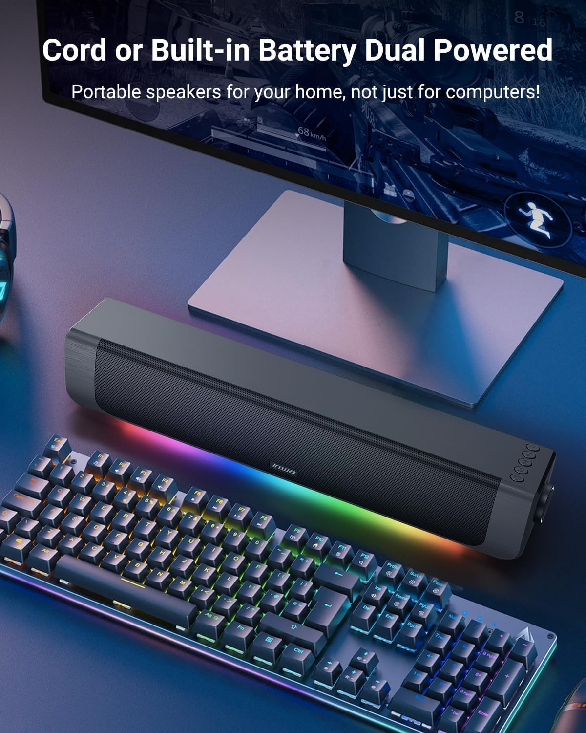 Inwa Computer Speakers, Cord and Battery Dual Powered PC Sound Bar, Wireless Lights Soundbar with Built in FM, Bluetooth/3.5mm Input/USB Drive Flash Support, for Desktop Monitor, PC, Tablets