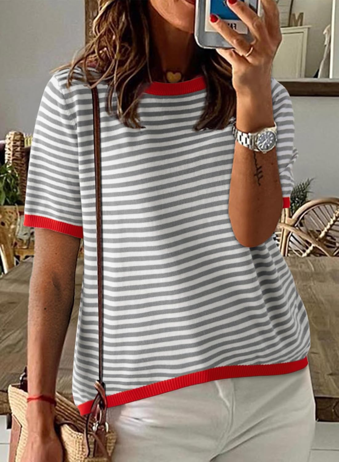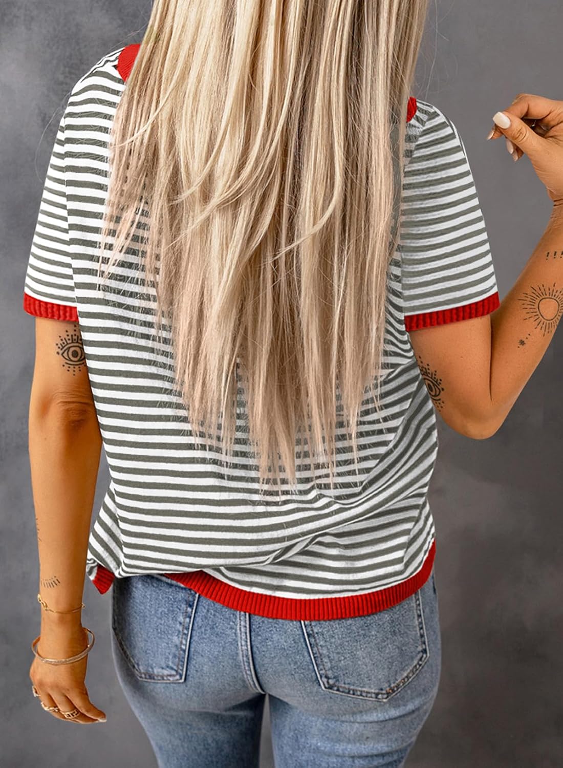 Occasion: Summer tops for women 2024 are perfect for lounging or casual events, party, date, work, home, vacation for all seasons. Features: striped pattern, slight color block design at the sleeves and bottom, patchwork pullover sweaters, short sleeve, loose style with a chic look,womens sweaters