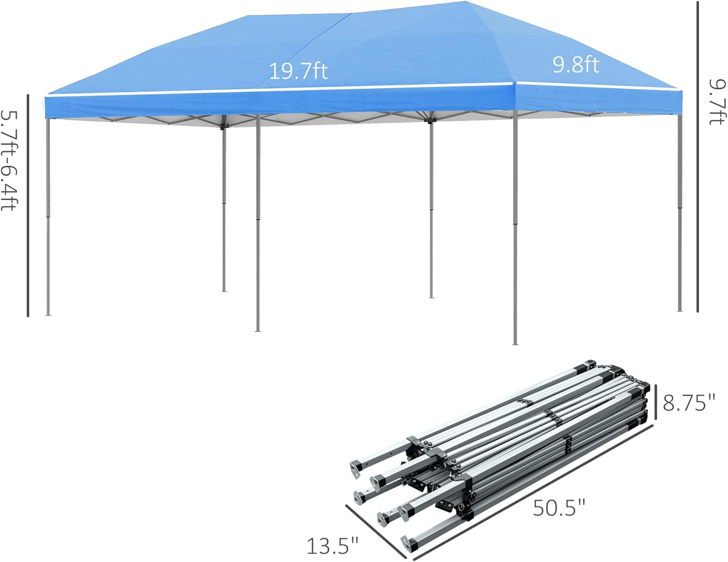 Pop-Up Tent Info: Overall Dimension: 19.7′ L x 9.8′ W x 9.5′ H, Peak Height: 9.5′ / 9.2′ / 8.9′, Sidewall Height: 6.4′ / 6.1′ / 5.8′, Folded Dimension: 50.4″ L x 13.4″ W x 8.7″ H, Net Weight: 61 lbs. Note: Not to be left up during adverse weather or inclement weather conditions which includes rain, snow, sleet and hail as they will add weight that can cause the tent to collapse.