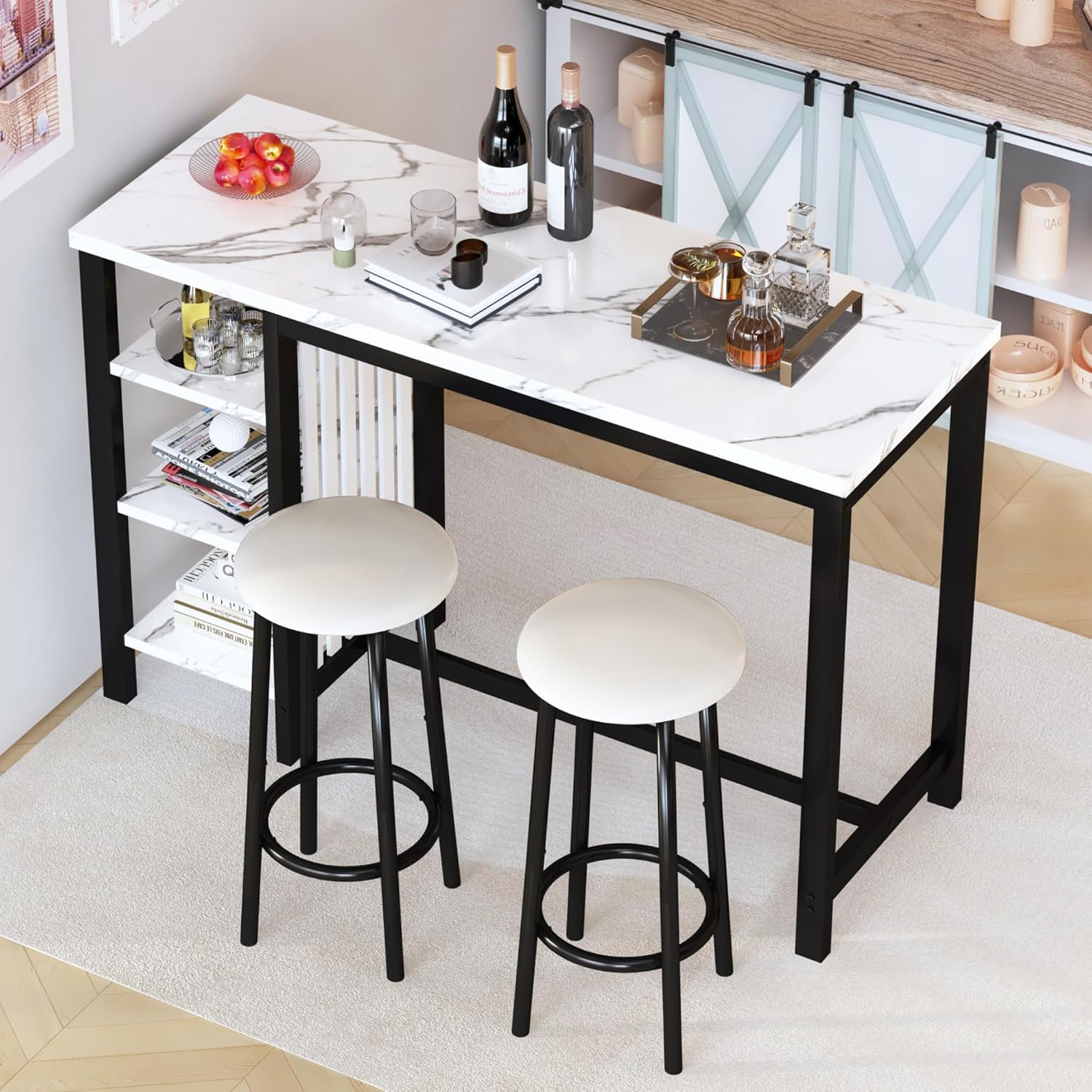 Lamerge Kitchen Counter Height Table and Stools Set for 2, 4-Tier Compact Dining Table, White Faux Marble Top and 2 PU Leather Upholstered Seats, Modern Dining Room Furniture for Home/Studio/Office
