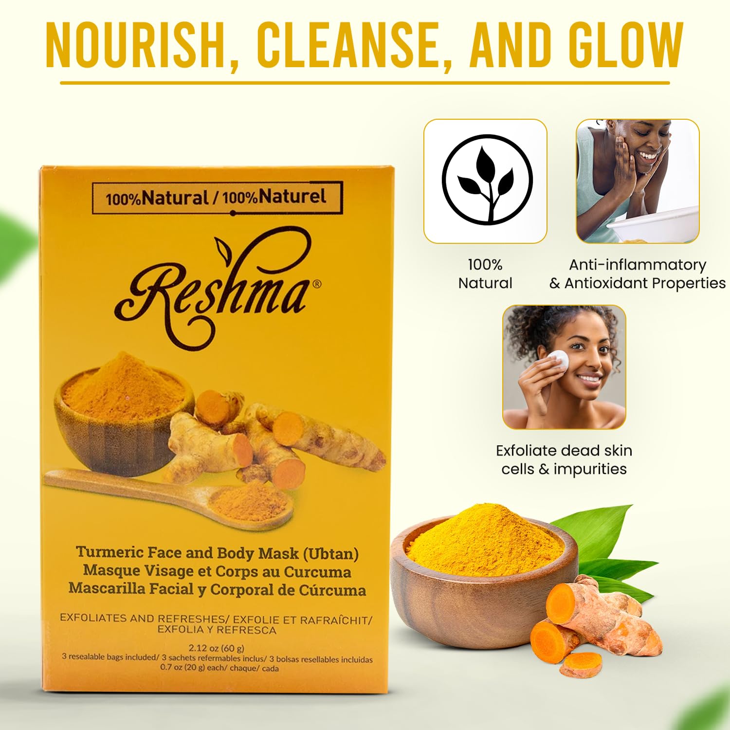 Hyperpigmentation Relief: With the power of turmeric, this mask helps reduce the appearance of dark spots and hyperpigmentation, promoting an even skin tone.