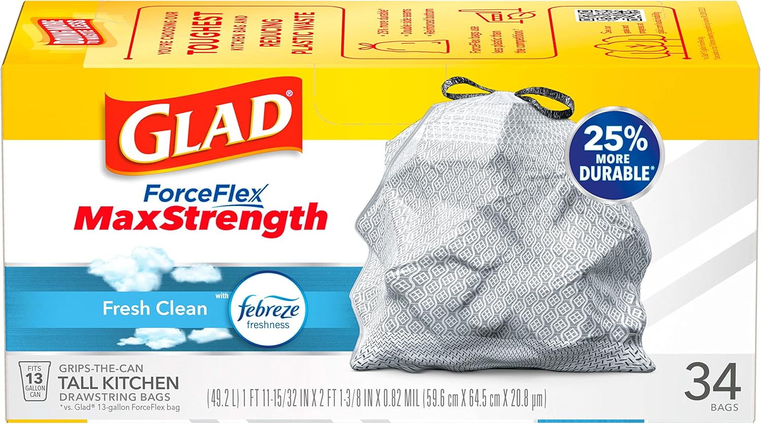 GLAD TRASH BAGS WITH FORCEFLEX MAXSTRENGTH: Handle daily kitchen and household demands with Glad’s 13 gallon tall kitchen garbage bags in a Febreze Fresh Clean scent
