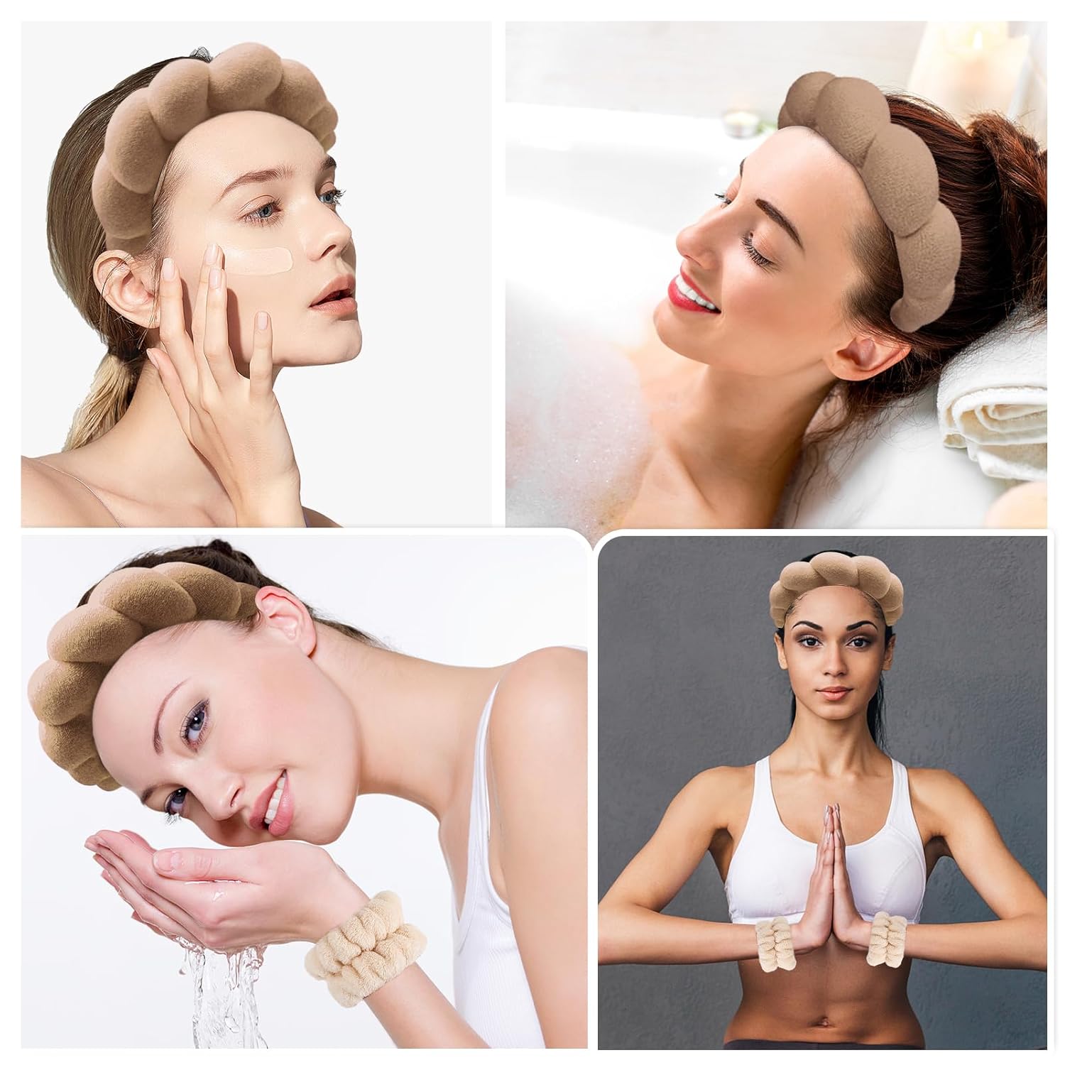 Spa Headband for Washing Face Wristband Set Sponge Makeup Skincare Terry Cloth Bubble Soft Get Ready Hairband for Women Girl Puffy Padded Headwear Non Slip Thick Hair Accessory(Brown-2)
