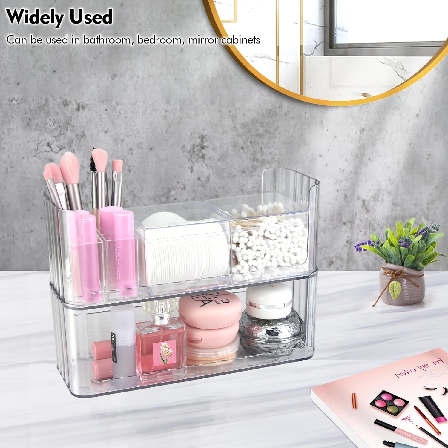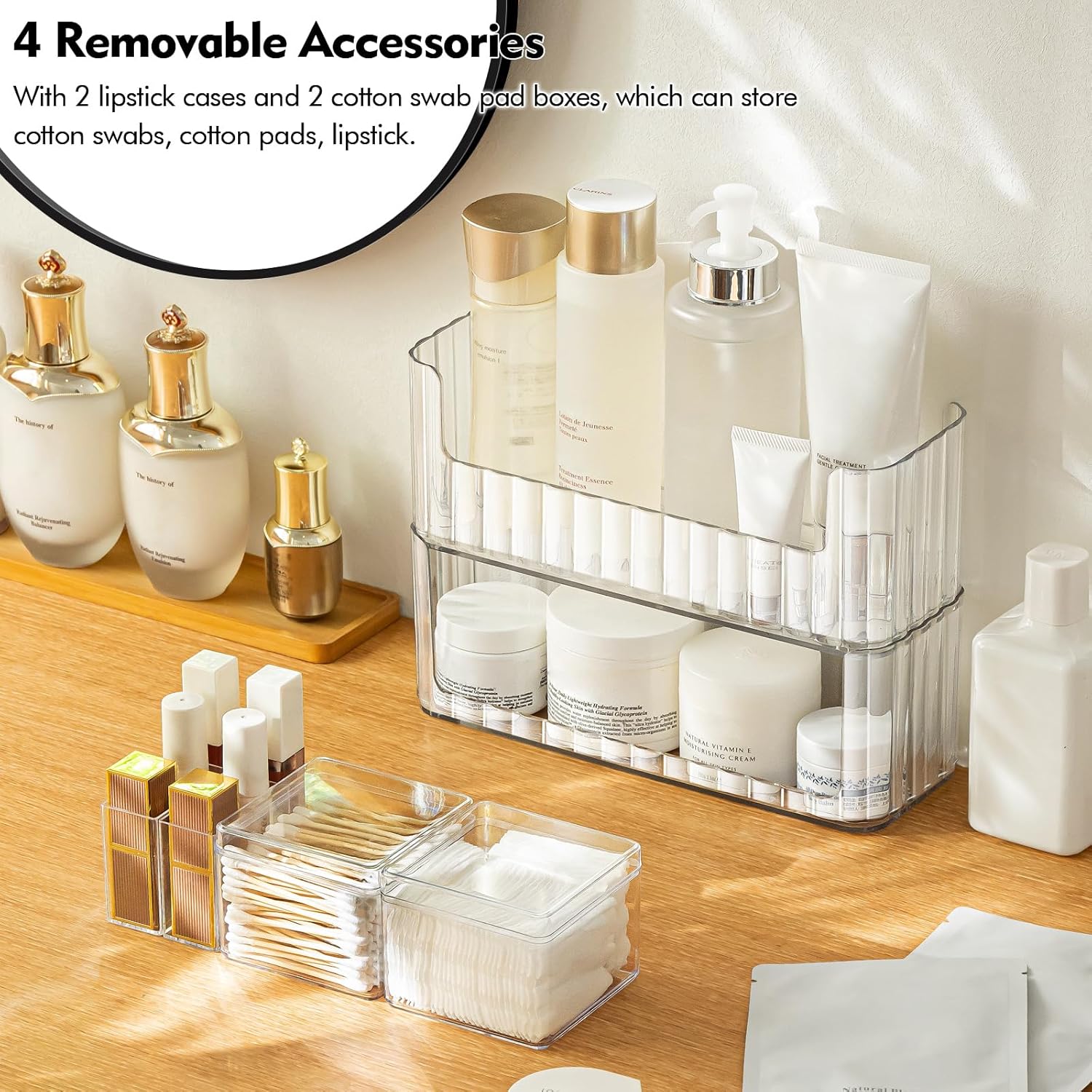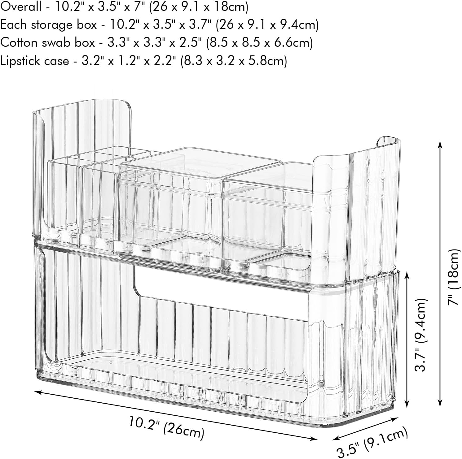 Poeland 2 Pack Stackable Makeup Organizer Tray, Transparent Cosmetic Display Case with 2 Lipstick Cases and 2 Cotton Swab Pad Boxes, Medicine Cabinet Shelves Organizer