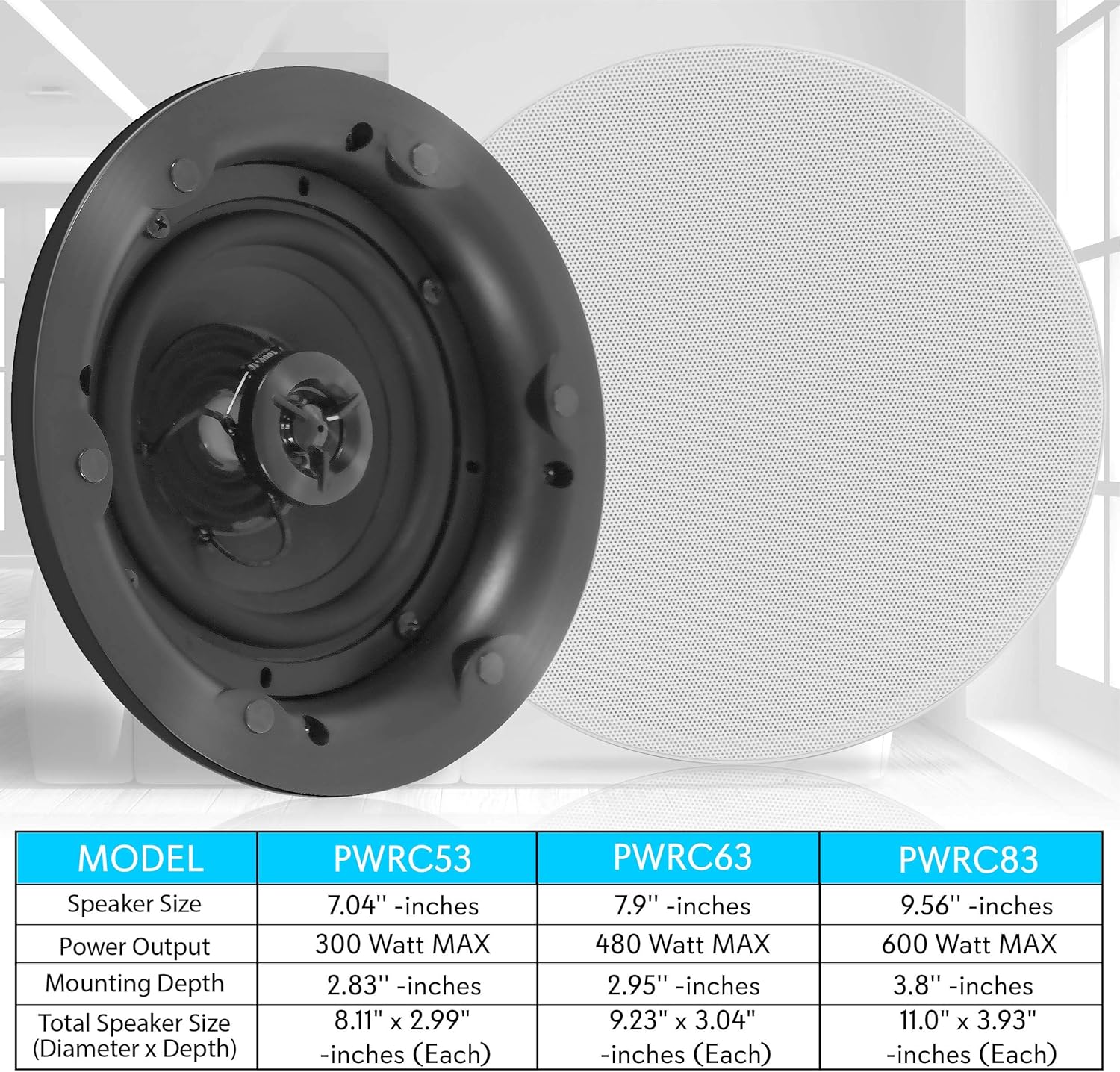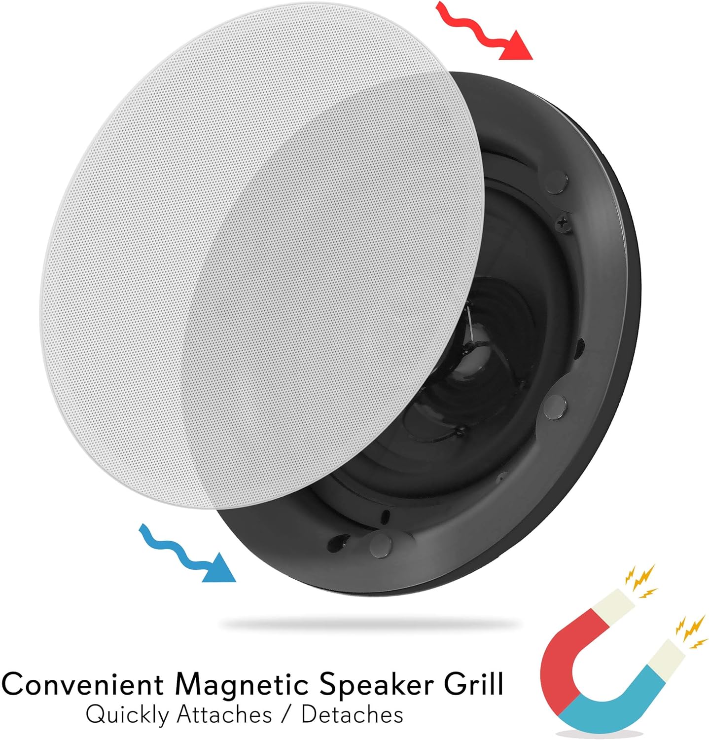 Features: – In-Wall / In-Ceiling Speaker System – Universal Flush Mount for Any Flat Surface – Flat & Thin, Slim-Style Removable Speaker Grill – Convenient Magnetic Speaker Grill Quickly Attaches / Detaches – 2-Way Full Range Stereo Sound Reproduction – 1/2” High Compliance Polymer Tweeter – Polypropylene Cone with Rubber Edge – Cut-Out Template for Easy Installation – Integrated Clamp-Type Mounting Brackets – Environmentally Friendly ABS Construction – Perfect for Custom Audio Applications – Used for Home, Office & Business What’s in the Box: – (2) 6.5’’ -inch Speakers – (2) Magnetic Speaker Grills – Cut-Out Template Technical Specs: – Power Output: 480 Watt MAX – Speaker Type: Passive – Speaker Style: Round / Circle – Frequency Response: 70Hz-20kHz – Impedance: 8 Ohm – Sensitivity: 89 dB – Cut-out Diameter: 7.9” -inches – Mounting Depth: 2.95” -inches – Total Speaker Size (Diameter x Depth): 9.23″ x 3.04″ -inches