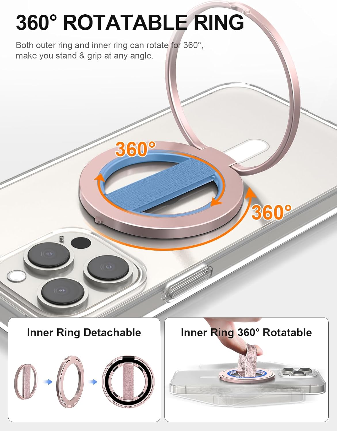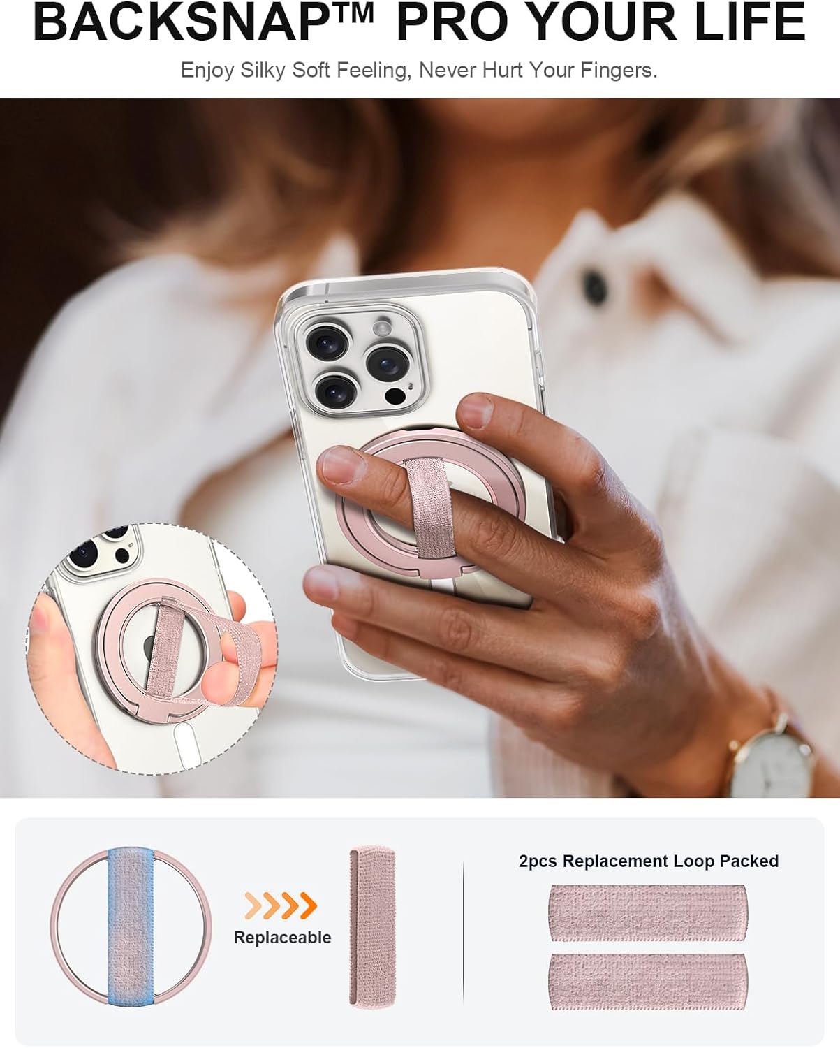 EWA MagOne Ultra Phone Grip Stand with Replaceable Elastic Finger Loop, Removable Magnetic Ring Holder Kickstand Loop, Double-Sided Magnetic Accessories for iPhone 15, 14, 13 Pro/Max/Plus-Rosegloden