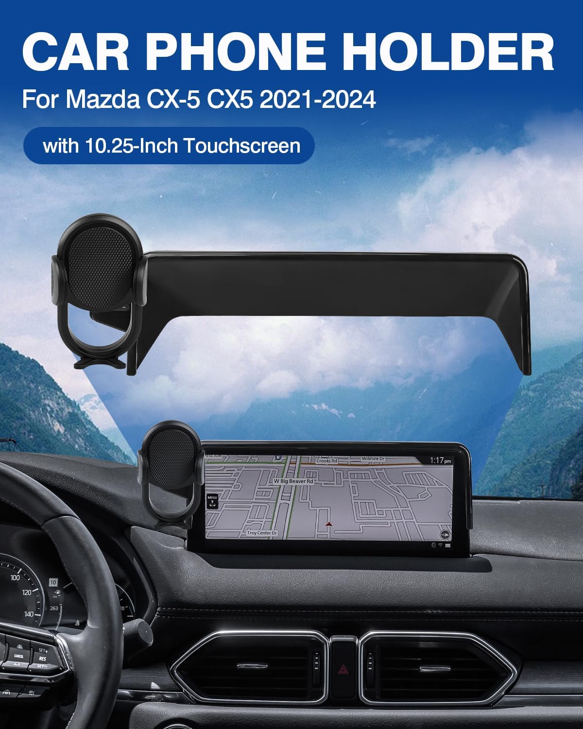 Specially designed for Mazda CX-5 CX5 2021 2022 2023 2024 with 10.25-inch touchscreen.With the navigation screen holder as the base, it does not affect the normal airflow of the car air conditioner.One must-have accessories for hold your phone while driving. Beauty and practicality coexist. No need to worry about you phone will fall off.Be made of high-grade ABS. Not only improves the quality, but also ensures the long service time.