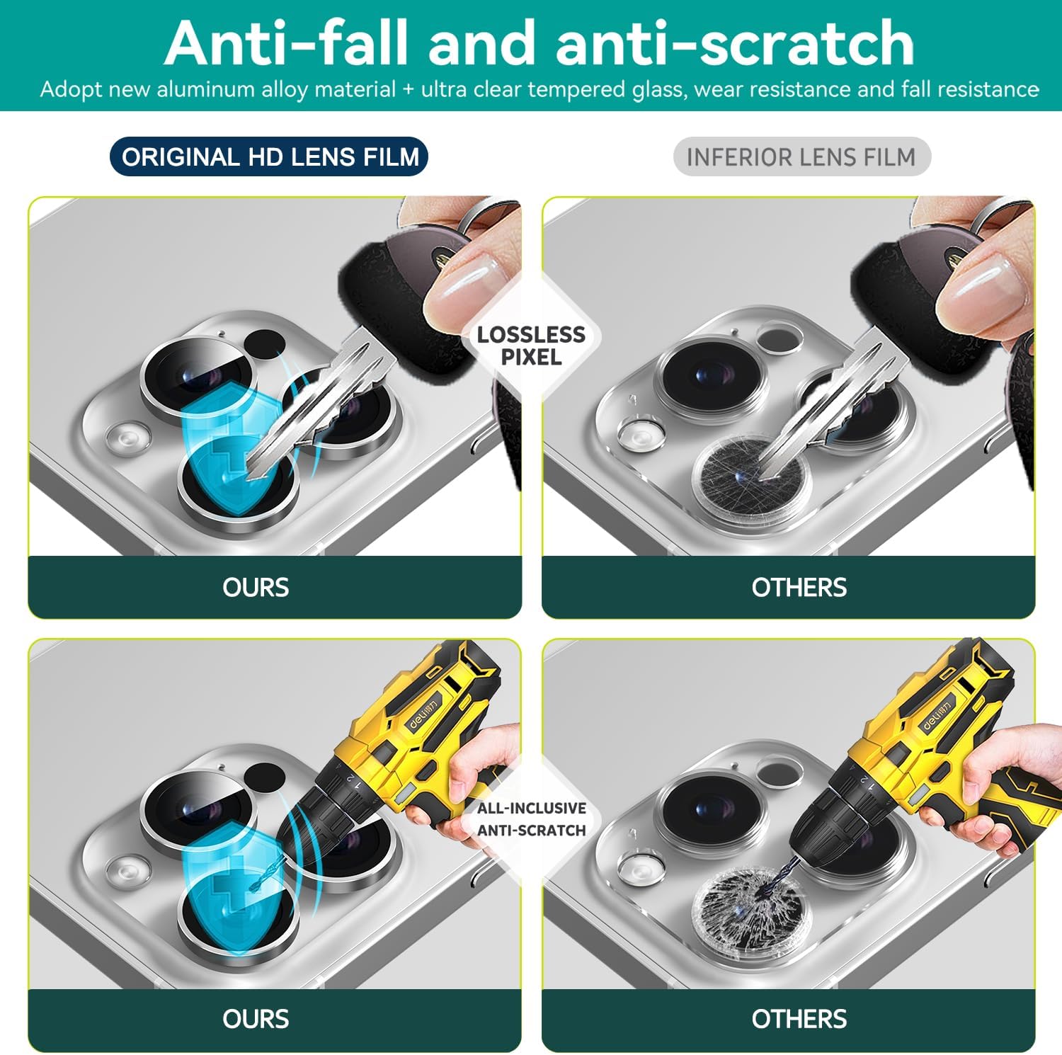 Aluminum alloy metal 9H tempered glass camera lens protective film, specially designed for iPhone 15 Pro/15 Pro Max .Not compatible with other models. The best service and solution will be provided for you by KSKSPE, if you have any problem of this product, please do not hesitate to contact us and we will solve it for you within 24 hours.