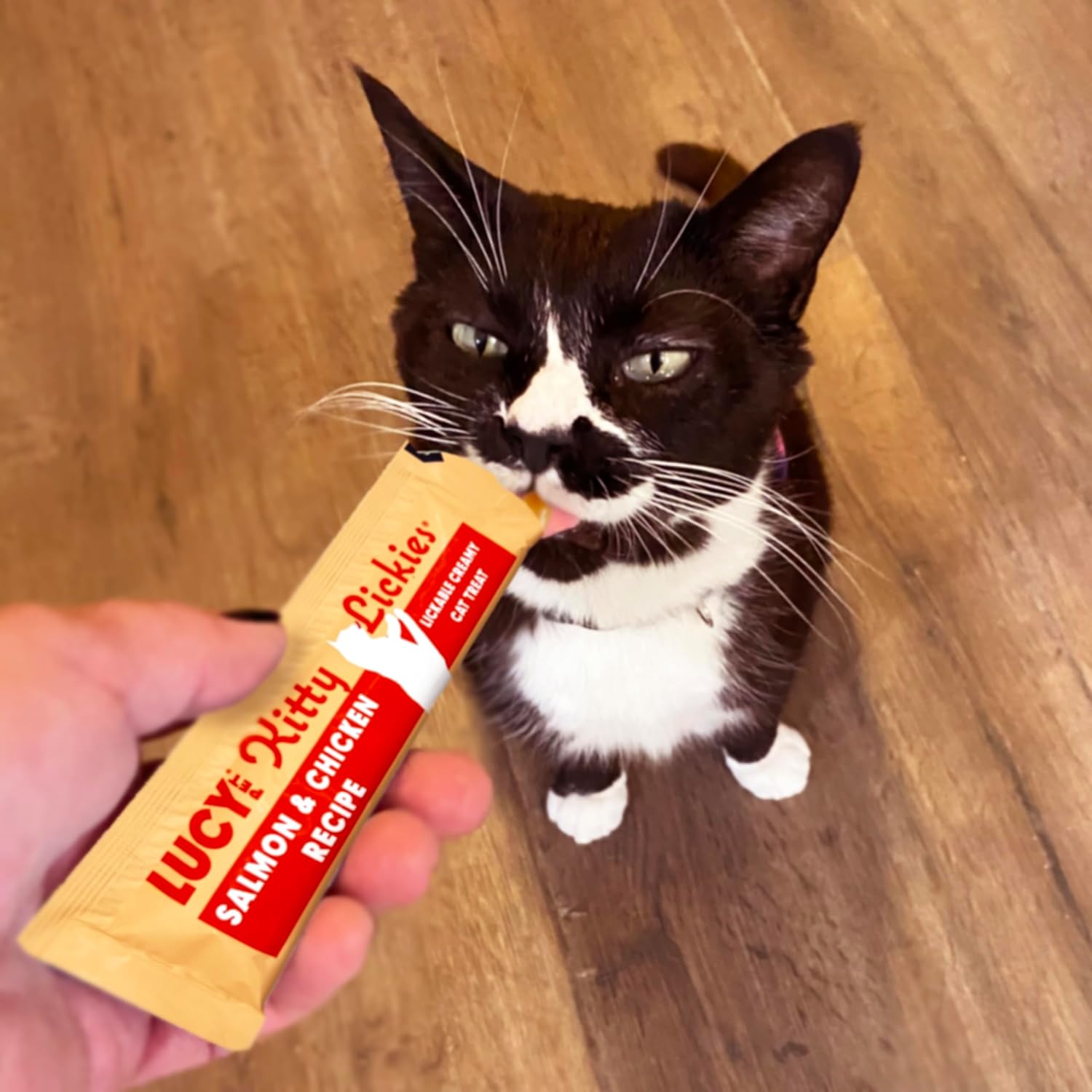 Lucy Pet Kitty Lickies are scrumptious lickable mousse cat treats and food toppers. Your cat will enjoy Kitty Lickies directly from the pouch or you can squeeze over dry food for an extra special treat