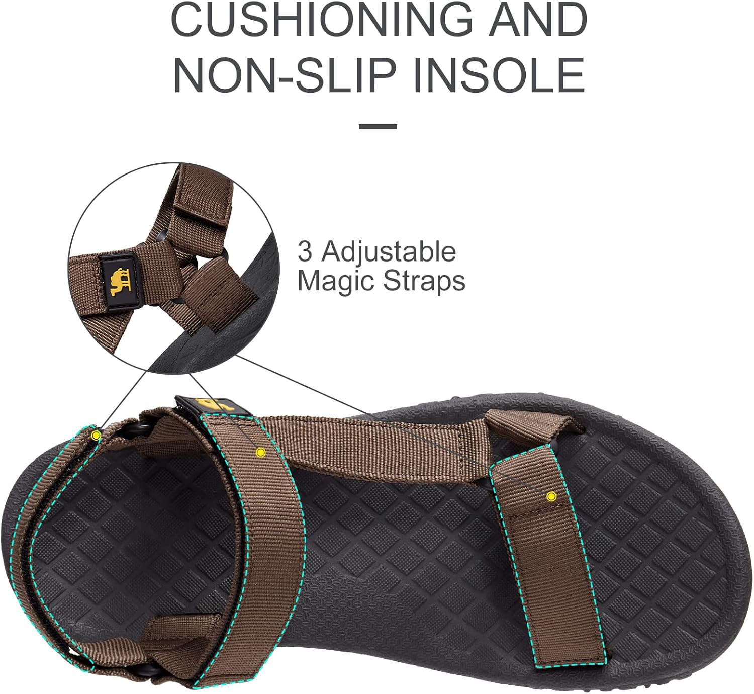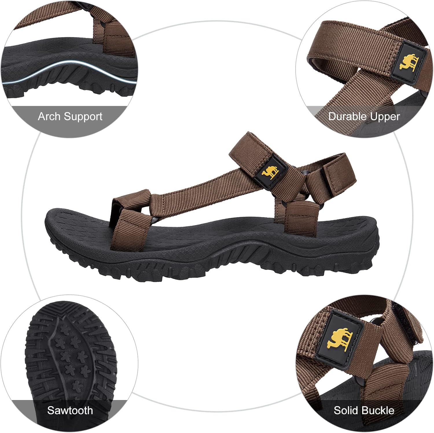 The upper of this water sandals is made of Polyester webbing, which is breathable, durable and has quick drying property. You can adjust the magic straps to make the shoes more suitable for your foot and ensure the shoes fit to the instep and are not easy to loose off. The CAMEL CROWN sports sandals for men is anti-skidding due to the Quilted Lining on the insole and the sawtooth on the rubber outsole even if walking in the stream. What’s more, when you attend outdoor activities or do exercise, the soles that fit the curve of the foot can offer great arch support and make sure you don’t feel tired after long walking. CAMEL CROWN providing you the comfortable and safe wearing experience.
