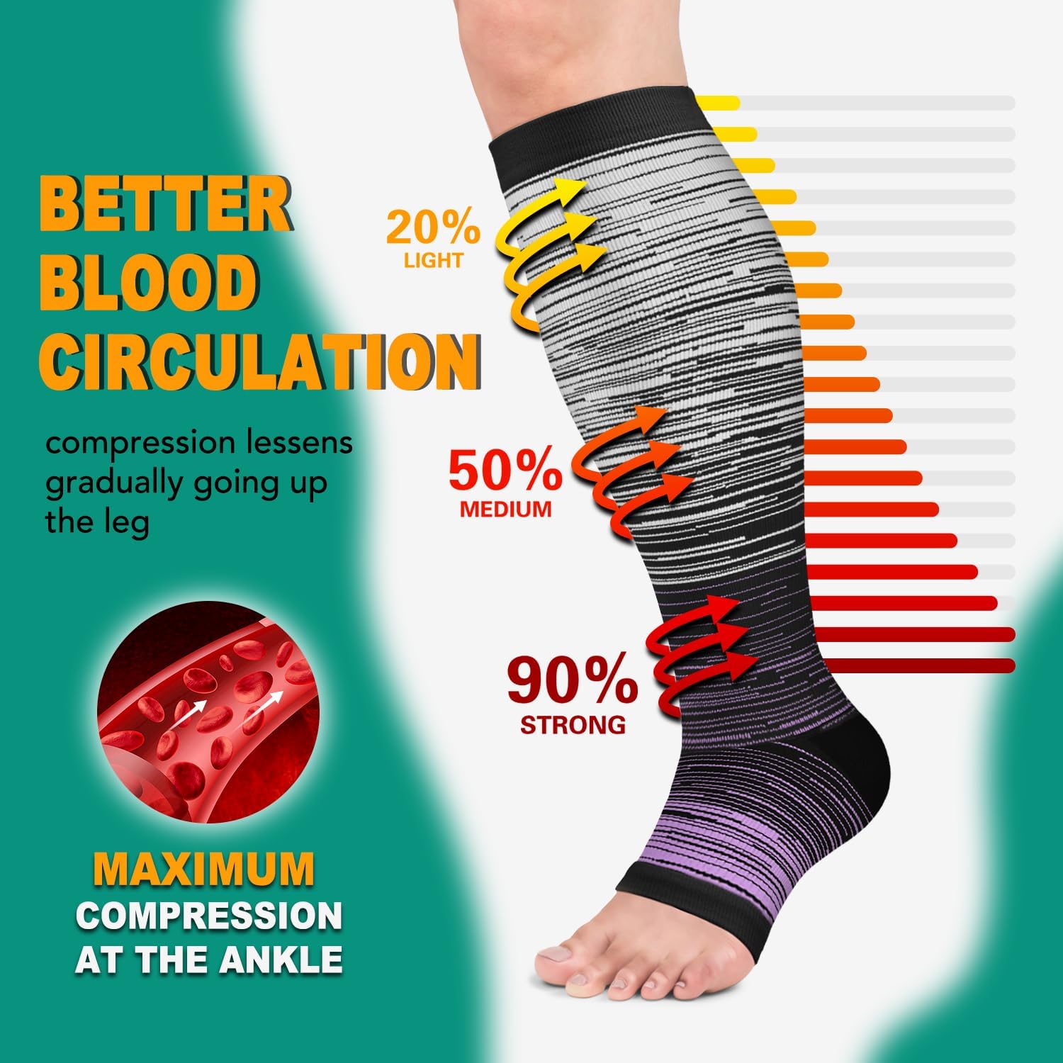 👨‍⚕️OPEN TOE DESIGN ​- Made of breathable,our stockings feature an open toe and reinforced seams for good looking, durable support that’s easy to wear. High performance material can keeping your muscles cool during workouts and warm during rest. 360-degree stretch for greater flexibility and durability. There are suitable for runners, athletes, fitness workouts, hiking, tennis, cycling, office workers, airplane travelers, or anyone on their feet all day.