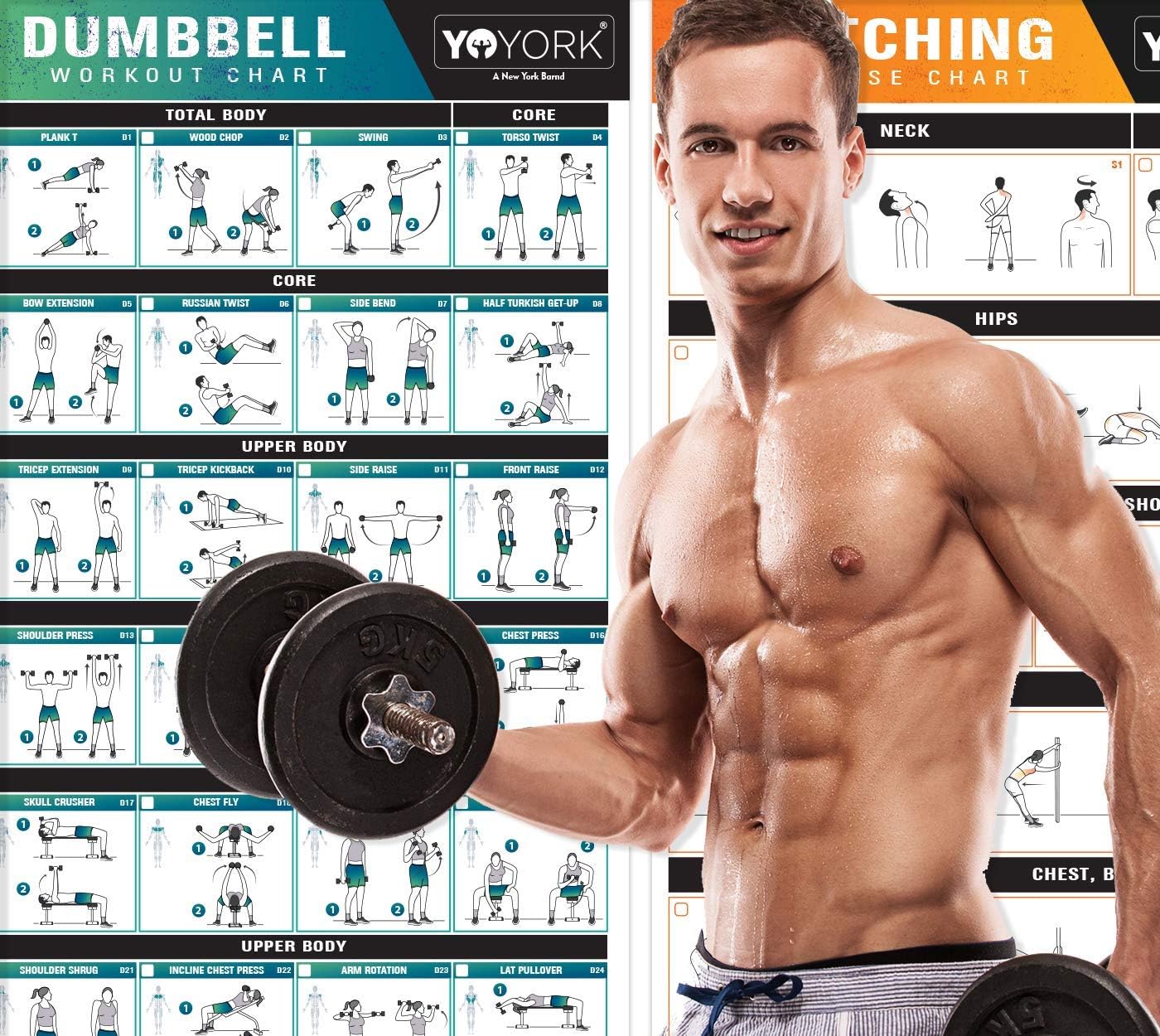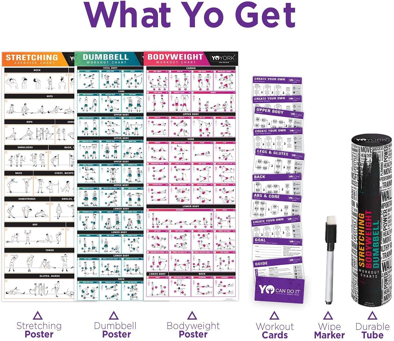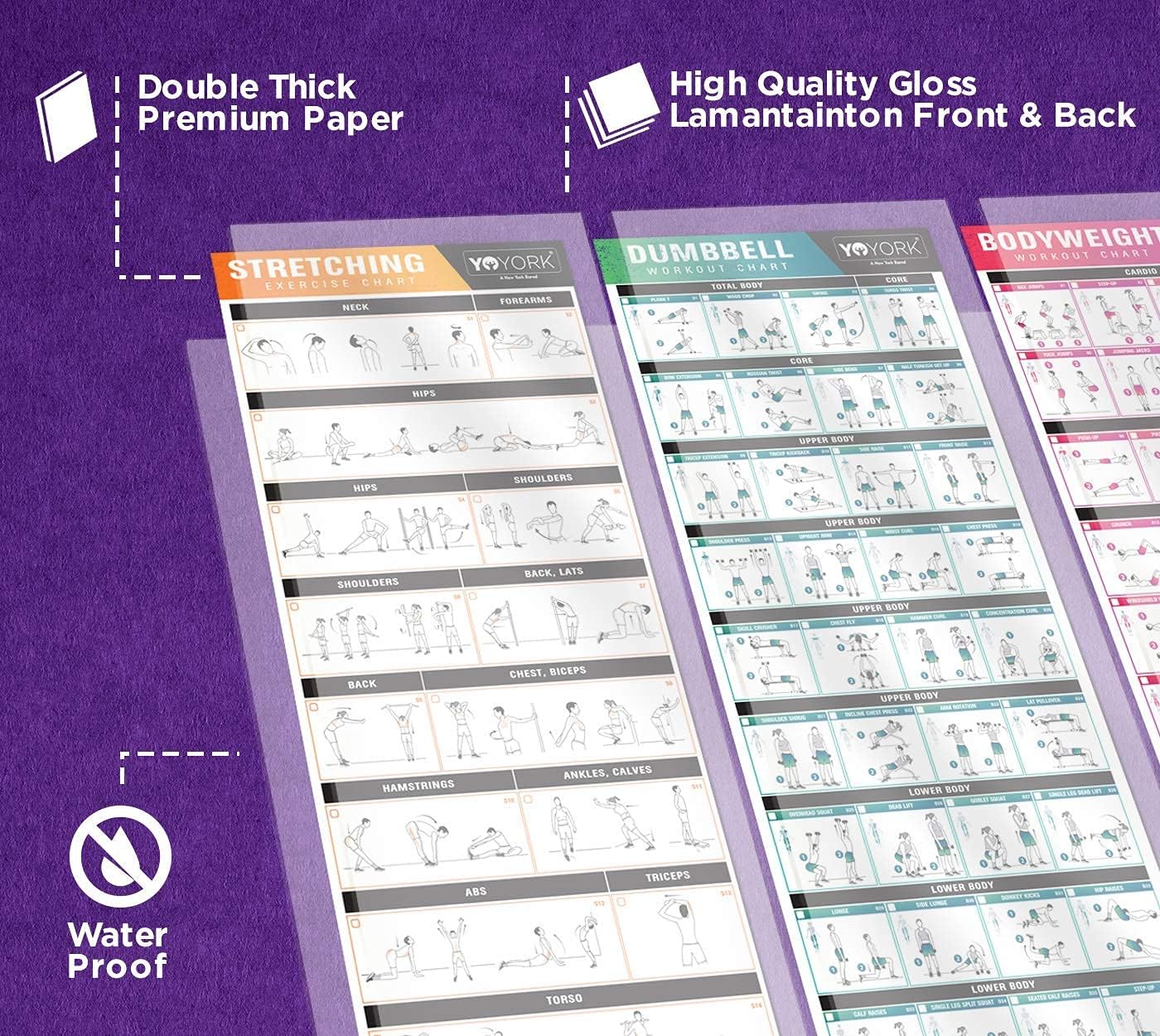 Exercise Posters for Stretching, Dumbell & Bodyweight Training – Home Gym & Fitness Workout w Minimal Equipment Needed – Get Full Body Workout at Home – 3 Laminated Posters Plus Workout Cards