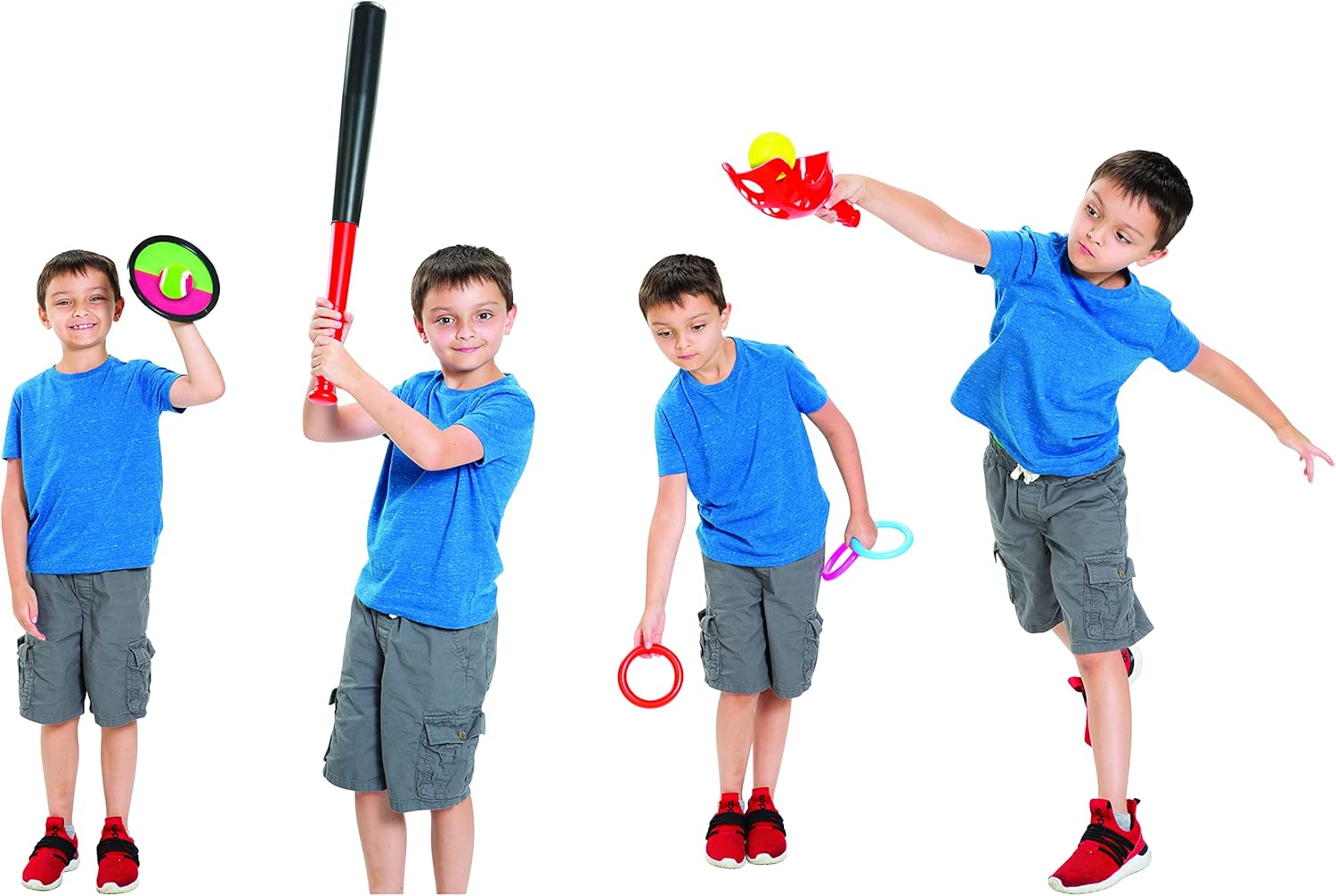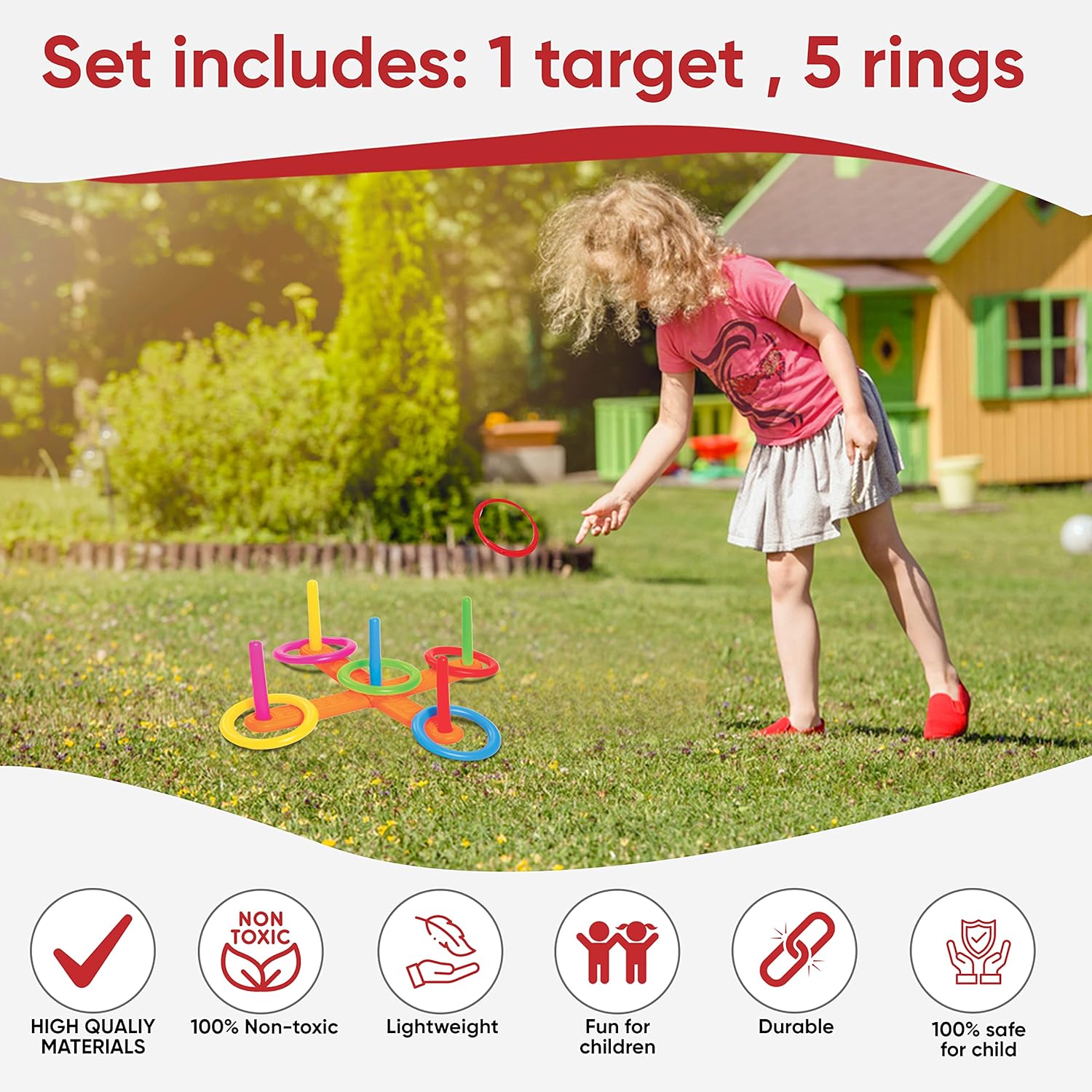 5 in 1 complete Game set: The 5 in-1 game set is a complete pack of enjoyment, It includes a Ring Toss game, baseball and bat, a Scoop ball set, a bowling set, and a catch and toss game.