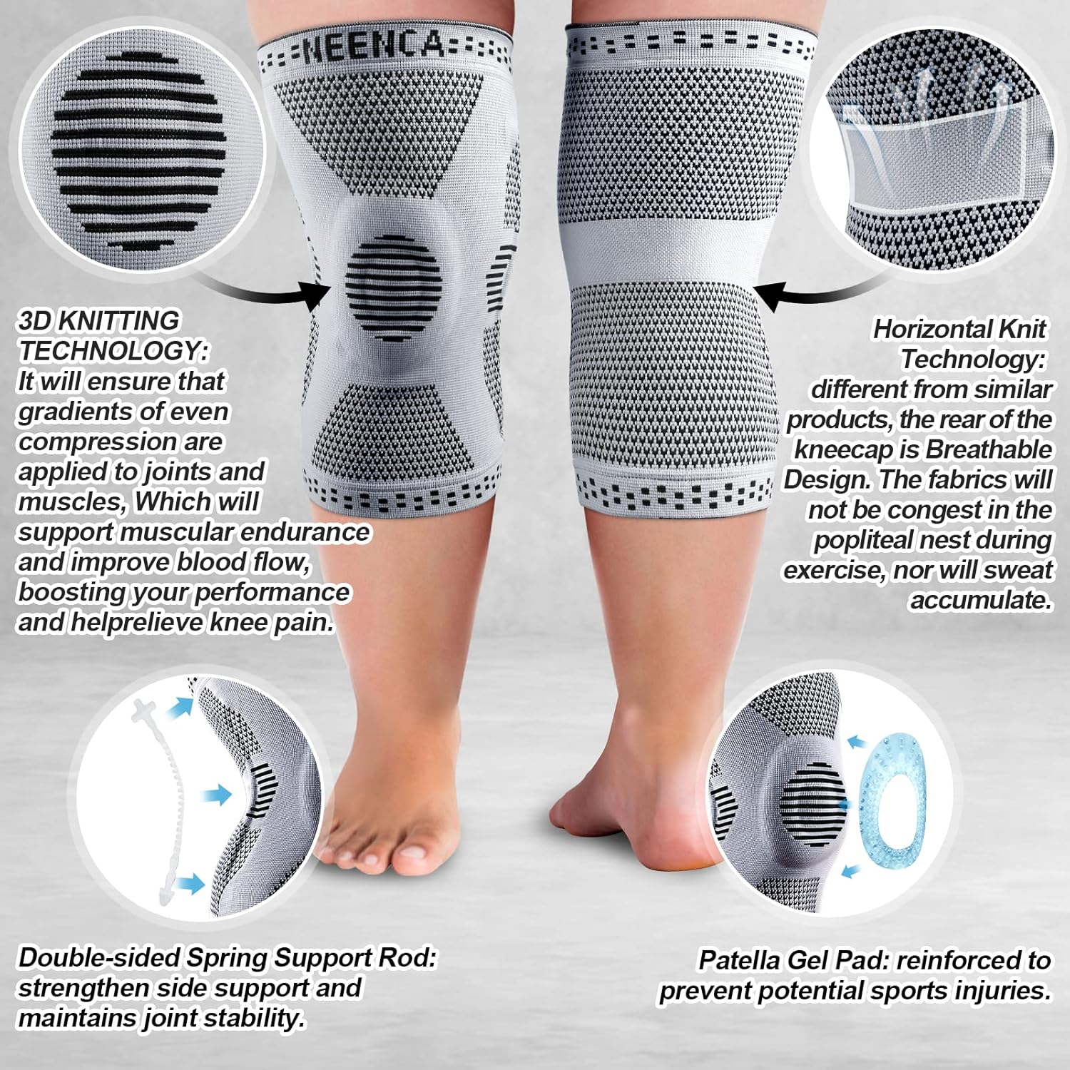 RELIBLE BRAND & MULTIFUNCTION— NEENCA is a professional outdoor supplies manufacturer, which occupy the first position of medical equipment for so long. Professional knee sleeves for meniscus tear, arthritis, ACL, joint pain relief, sports injury recovery. Widely used in many sports such as weightlifting, basketball, running, jogging, volleyball, CrossFit, gym, tennis, hiking and more!